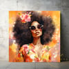 Watercolor 1970's Bohemian Woman Digital Print with Afro and Sunglasses, Orange Abstract Bohemian Hippie Design with Abstract Background, Instant Download