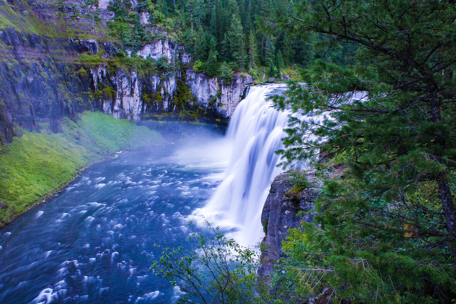 Upper Mesa Falls pours over ancient volcanic rock formed during earlier eruptions linked to the Yellowstone hotspot. The water cuts cleanly through the landscape, revealing layers shaped by fire long before water took over.