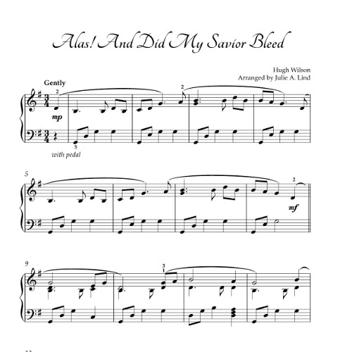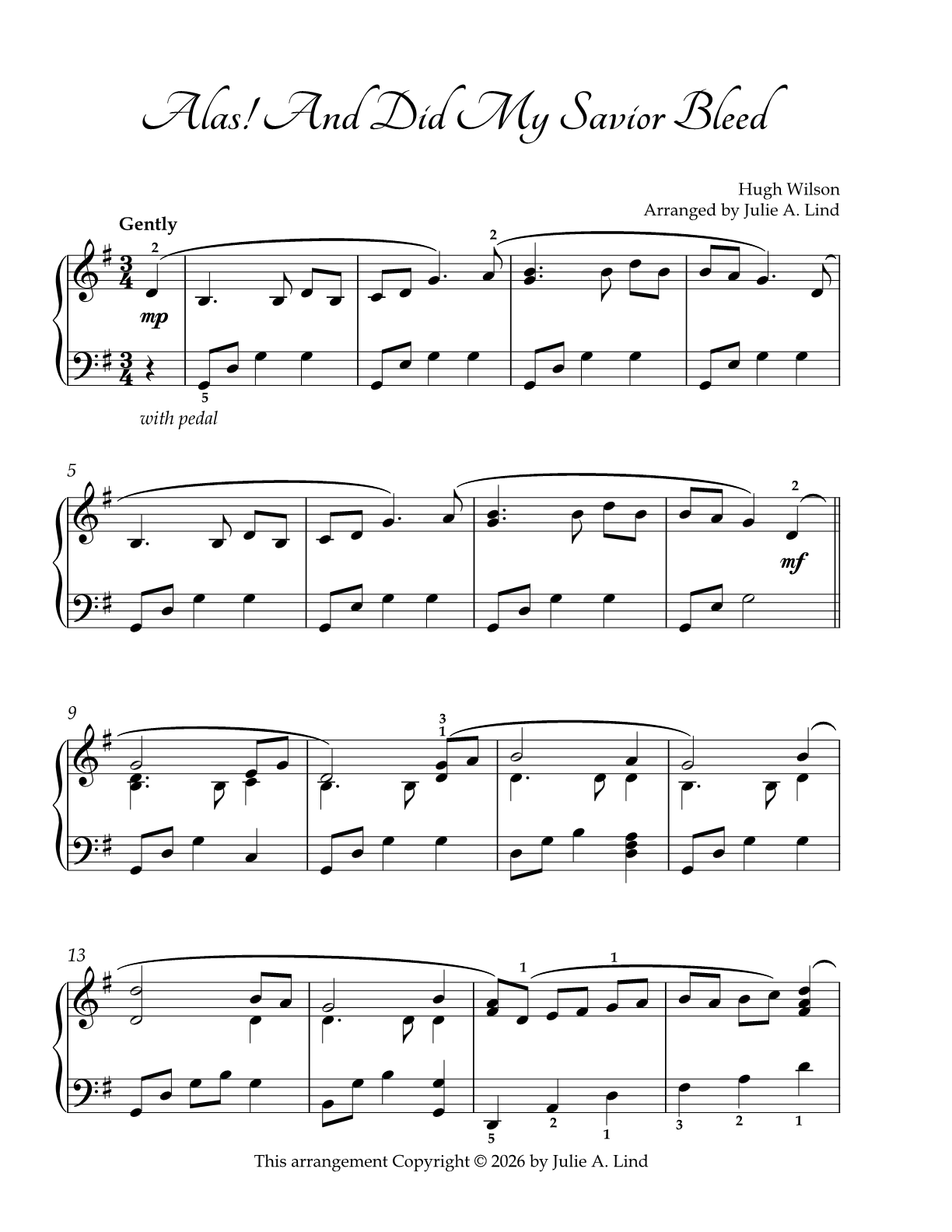 A lyrical intermediate piano arrangement of "Alas And Did My Savior Bleed", featuring a flowing introduction and an expressive, reflective mood. Ideal for Lent and Easter. Created for church pianists seeking easy-to-learn music for Preludes, Communion, and Offertory during worship services, or for personal reflection during the Lenten season.