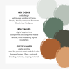 + Detailed Hex Codes, RGB, and CMYK values for each color