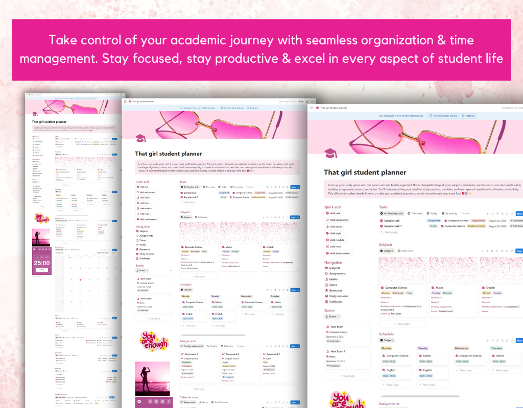 Introducing the That Girl Student Planner, a sleek and dynamic Notion template designed to empower you to take control of your academic life. This all-in-one planner not only simplifies your studies but also promotes productivity and focus, helping you embody the "That Girl" mindset—organized, prepared, and always ahead.