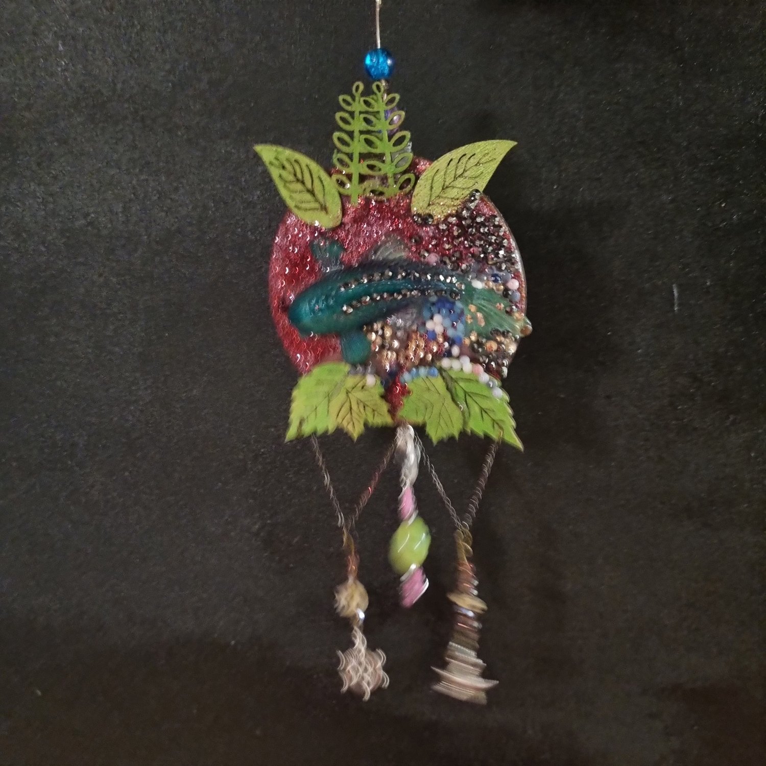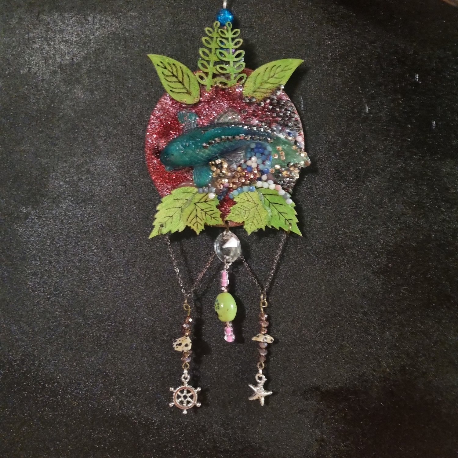 Bring a little magic and movement into your space with this one-of-a-kind handmade fish suncatcher. Set on a wooden backing, the centrepiece features a shimmering resin fish surrounded by delicate wooden leaves, sparkling rhinestones, and layered textures that come alive when the light hits.