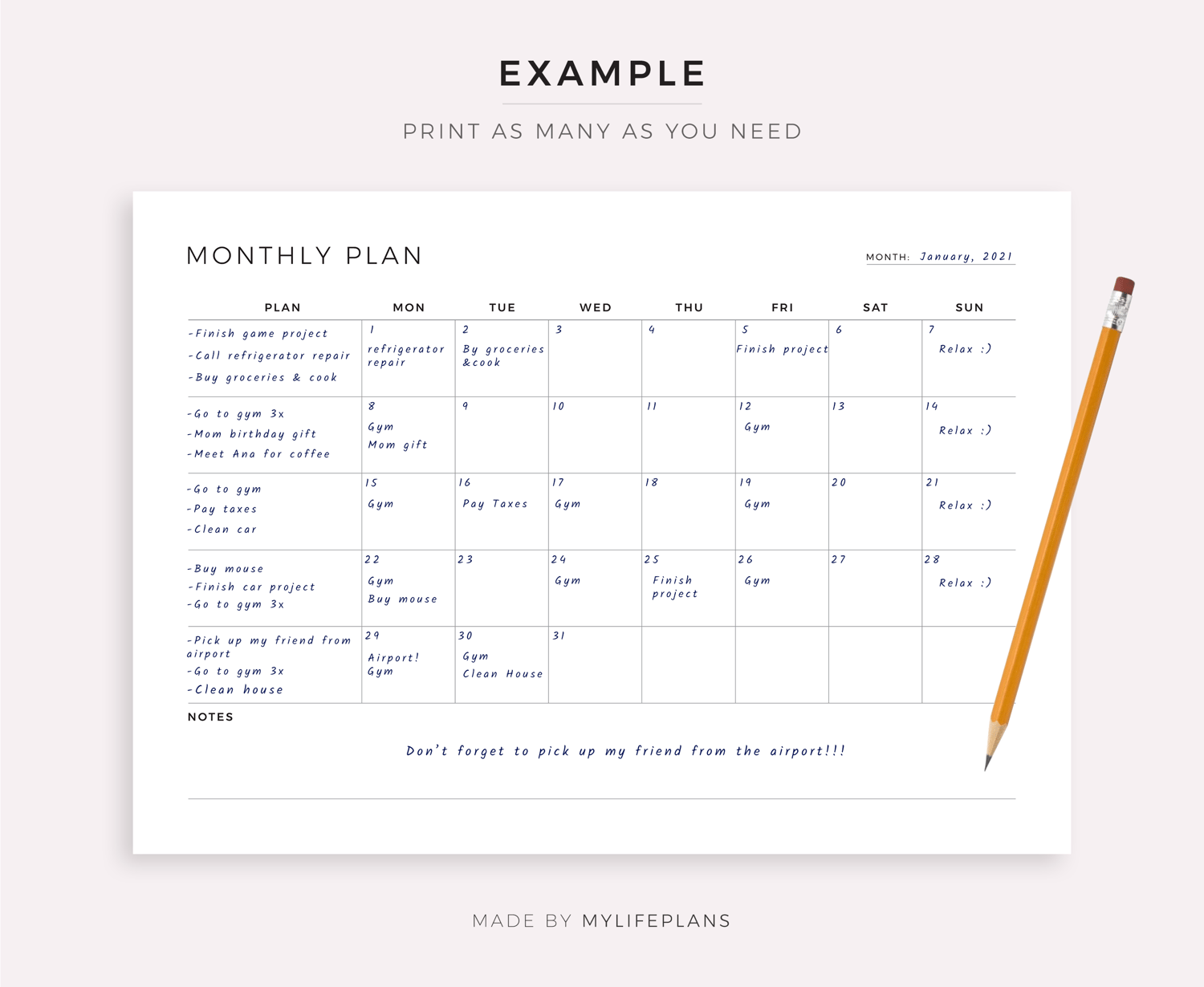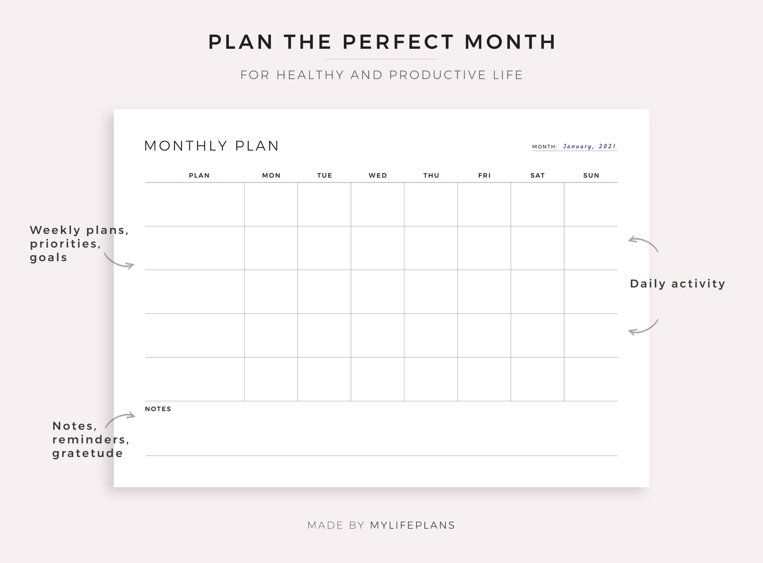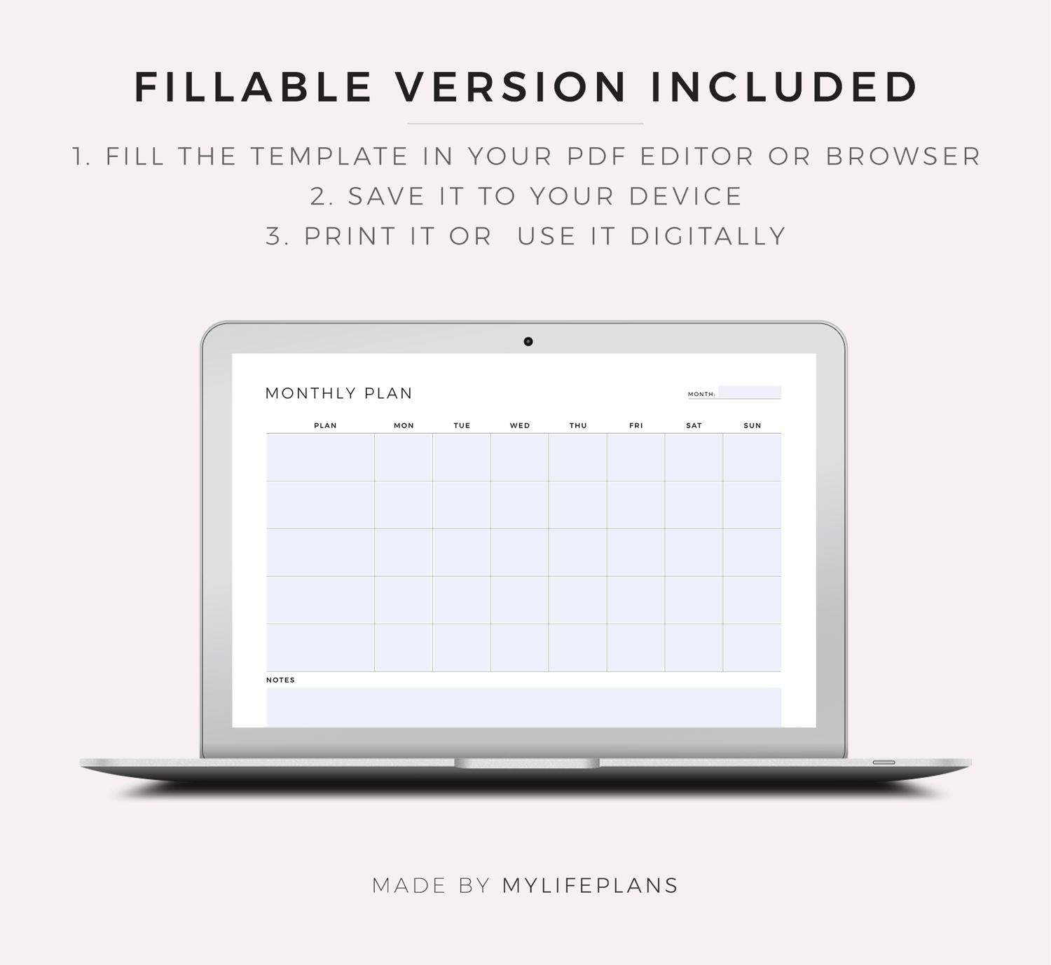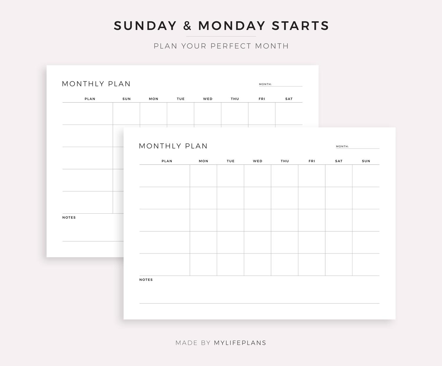 This is a printable blank monthly planner — just download, print, and start using it right away.