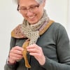 The asymmetric Join The Dots Shawl combines a great way to blend beautiful mini-skein shades with an interesting elongated stitch pattern. The shawl is knitted in garter stitch with an enlarged eyelet pattern worked in the subsequent shade. To make the enlarged eyelets, the needle is inserted into a yarn over made 3 rows below. A loop of yarn is pulled through from back to front and placed onto right hand needle. On the following row, the yarn loop is knitted together with the next stitch.