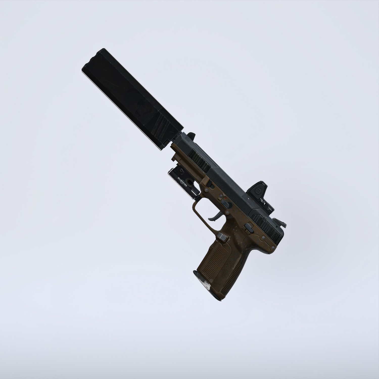 A beautiful pistol from FN. Assembled, converted and rigged for use in Daz, so you can make more realistic pictures, with moving slide, pulled trigger etc. Includes a laser, 2 kinds of silencers (round and square), red dot sight. All can be enabled or disabled.