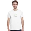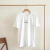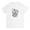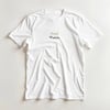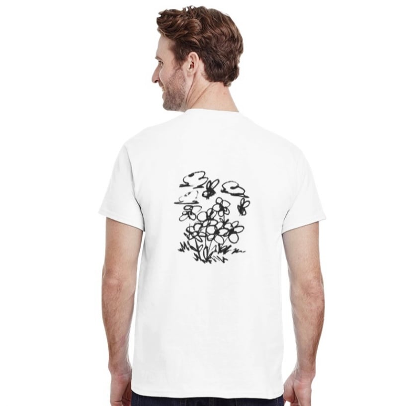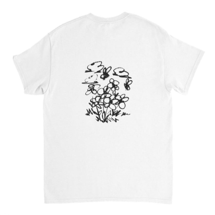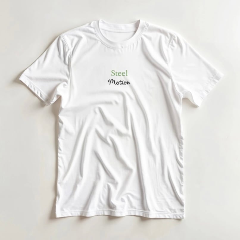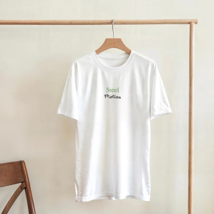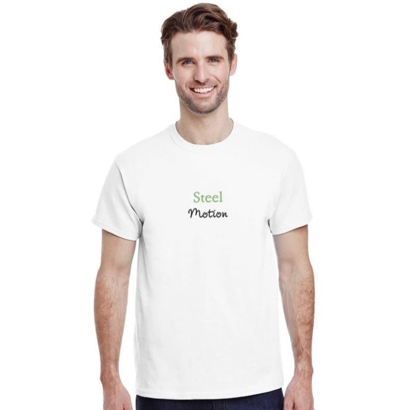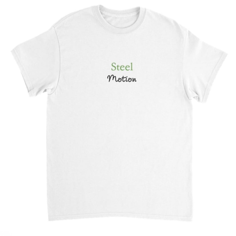 C’est un t-shirt blanc avec écrit Steel Motion sur le torse et à l’arrière, un motif fleuri noir.
