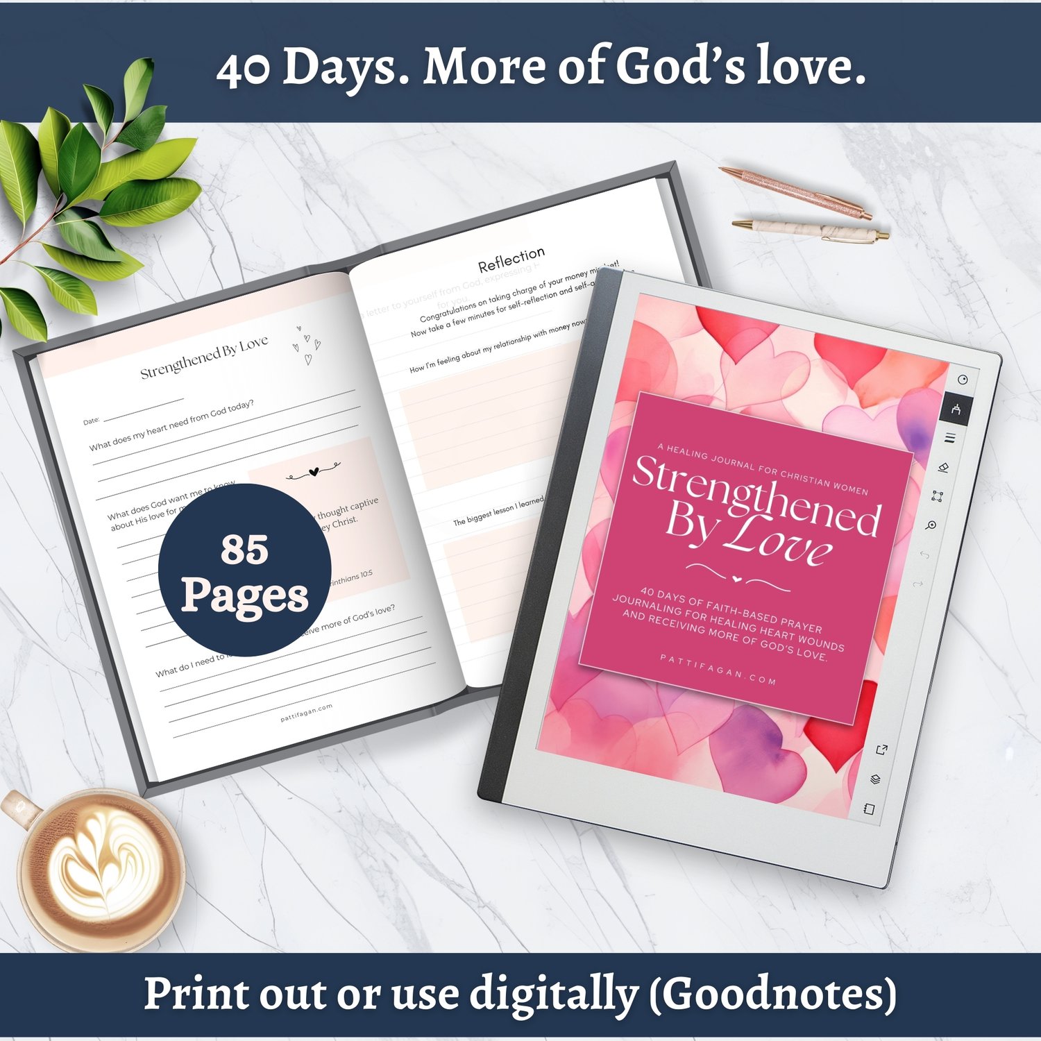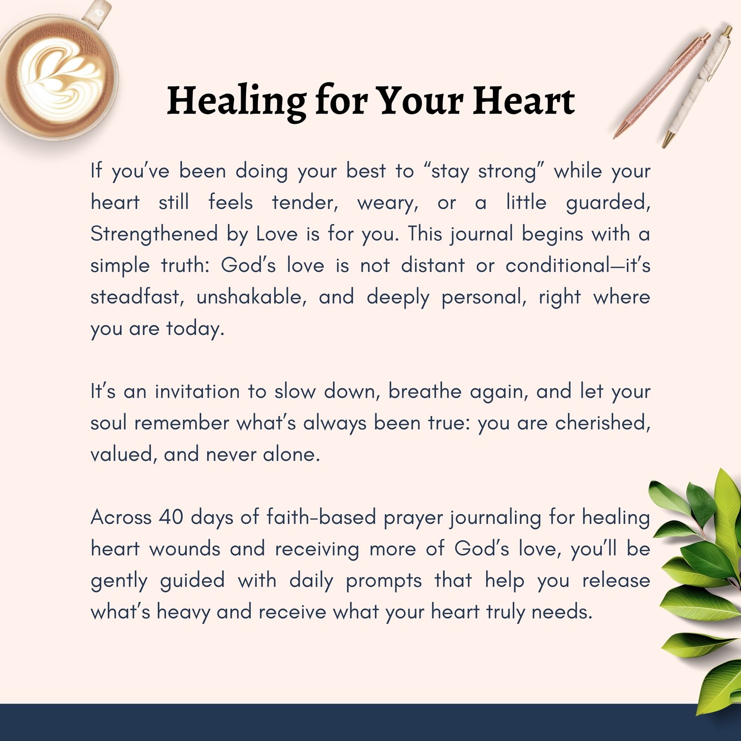40 days of faith-based prayer journaling for healing heart wounds and receiving more of God’s love, gently guide you with daily prompts that help release what’s heavy and receive what your heart truly needs.