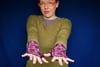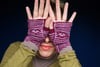 Use twisted and slipped stitches to put eyes on both palms; hold your hand out to an evil-doer as symbolic protection, or put your hands up to your face to turn your mitts into an instant creepy costume.