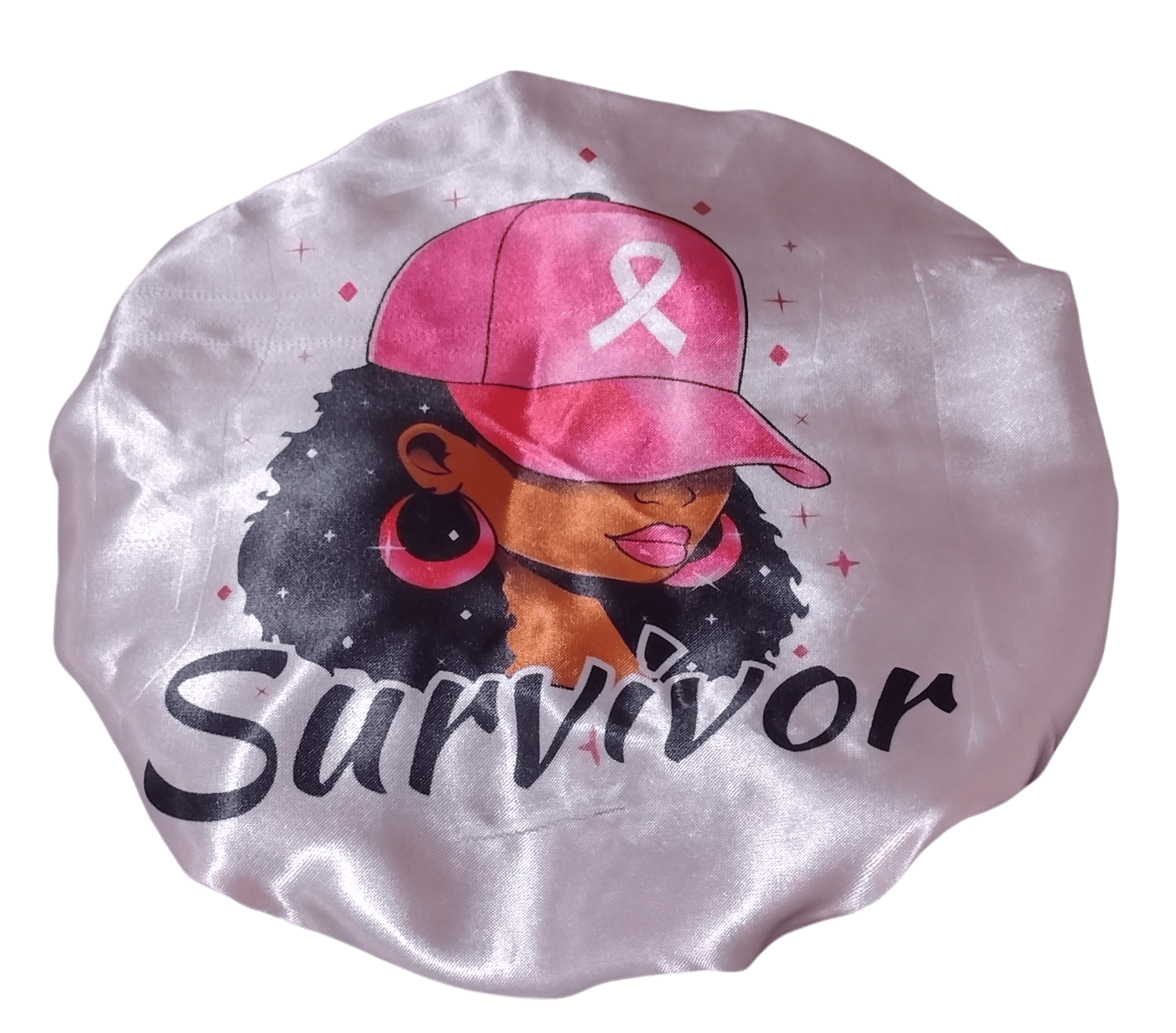 Breast Cancer Survivor is anyone who has ever been diagnosed with Cancer, regardless of their stage and is in remission following the conclusion of treatment. This bonnet is made 1st with love and 2nd with satin material. To all the women that are battling this disease, we pray for you and we will continue to fight with you.