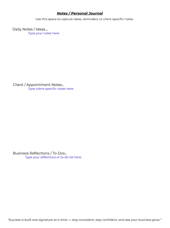 - Notes & Ideas Pages Space to jot down business goals, marketing ideas, or client reminders.