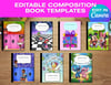 7 Editable fun school-themed composition book cover designs – perfect for notebooks, folders, and printables for personal use and small business use on physical products.