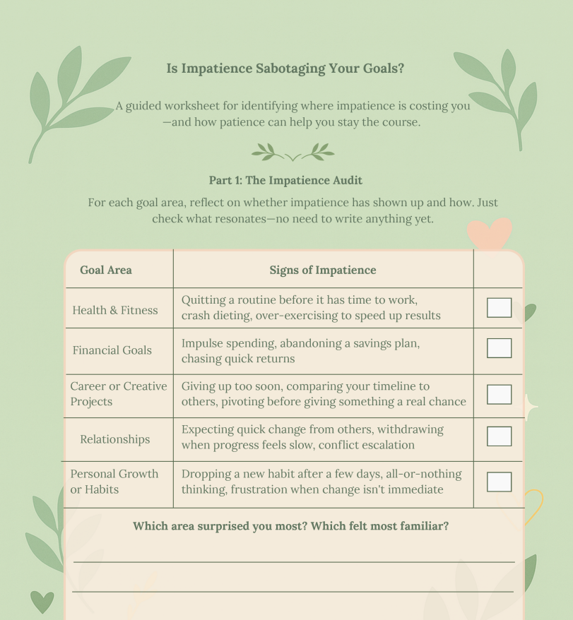 Is Impatience Sabotaging Your Goals? is a free five-page printable worksheet designed to help you identify where impatience is quietly undermining your progress—and build a patience-based plan to stay the course.