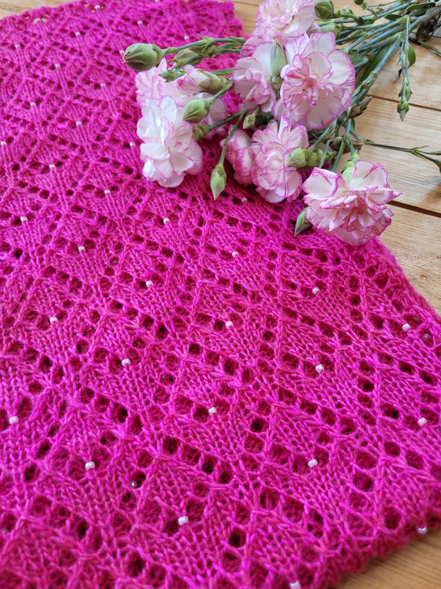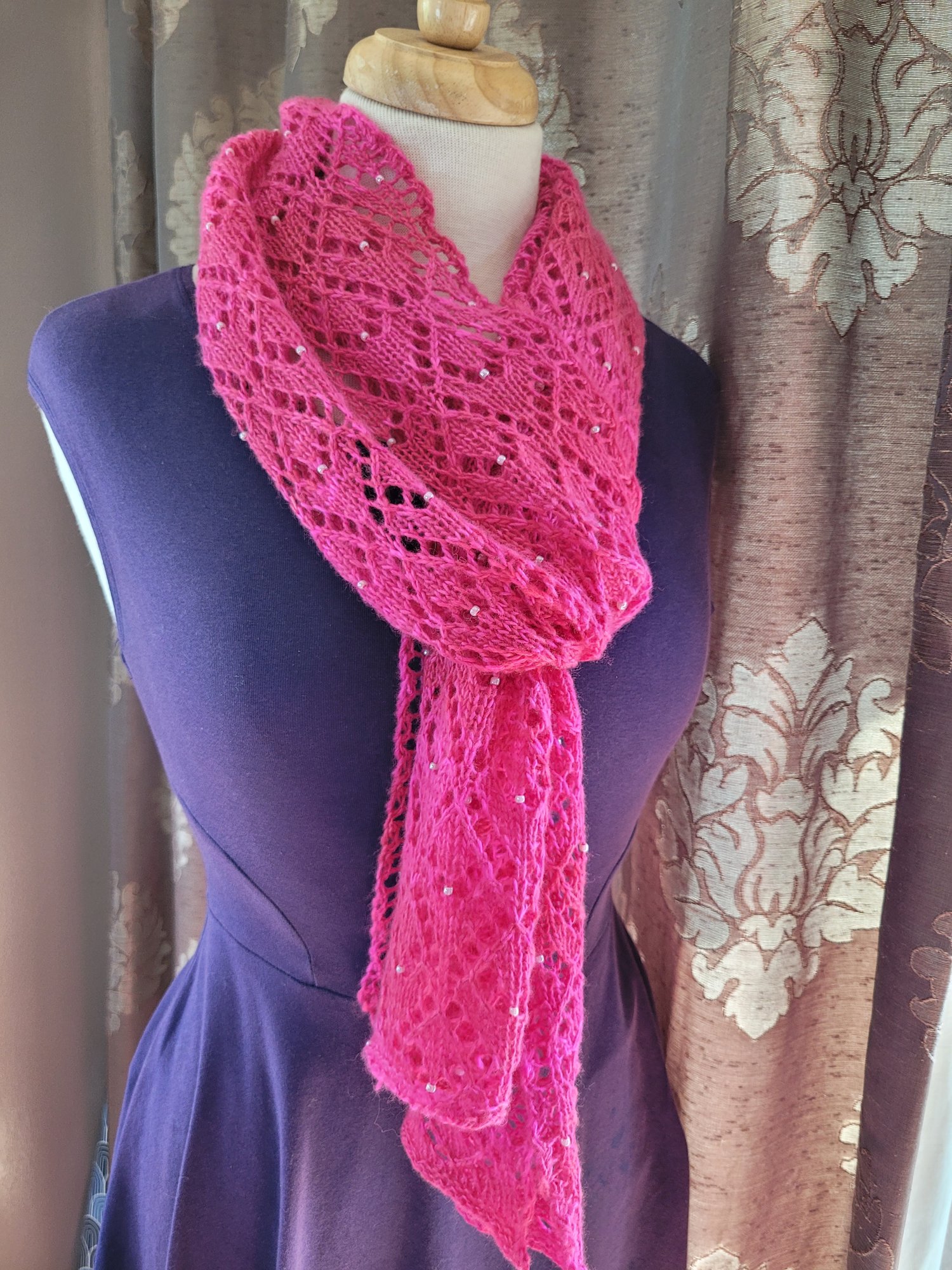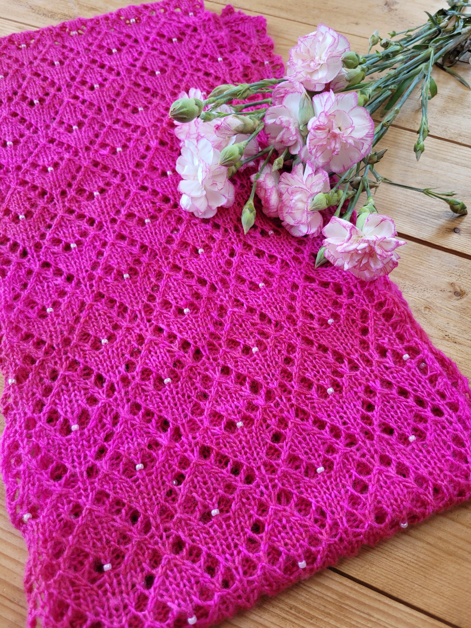 A delicate, pretty lace scarf with beads scattered throughout. A perfect small project for one special skein of 100g 4ply/fingering weight yarn. Can easily be adjusted to make it wider, longer or shorter (see notes in pattern).