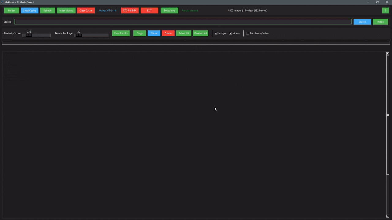 - Type anything in the search box and hit Search — or click the Image button to search using an image instead of text. You can also drag and drop any image directly from File Explorer onto the results canvas — no need to click anything. Note: drop onto the results area, not the upper control panel at the top.. Makimus finds visually similar images and videos in your collection. Video results show the best matching frame with its exact timestamp so you can jump straight to that moment in the video. Add a minus sign before any word to exclude it from results — for example "sunset -beach". For best results with negative terms lower the similarity score slider to 0.10 or below