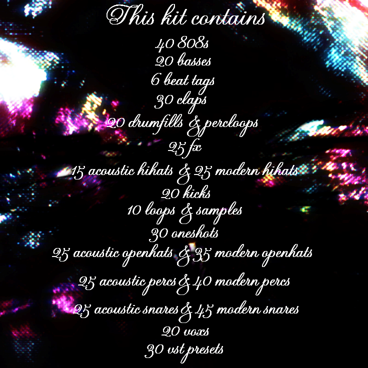 This kit includes all the essential sounds I use in my beats. The kit contains a variety of acoustic and modern sounds, they are the high-quality drums & sounds I rely on every day.