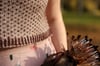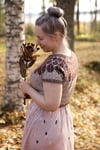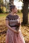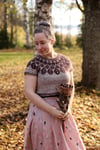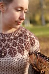 This sweater is worked top-down seamlessly. The sweater has a round yoke with a lovely feather pattern and the body of the sweater has a simple color work texture. The sweater has short sleeves and the hem is cropped. Please note that CC is held double throughout the pattern.