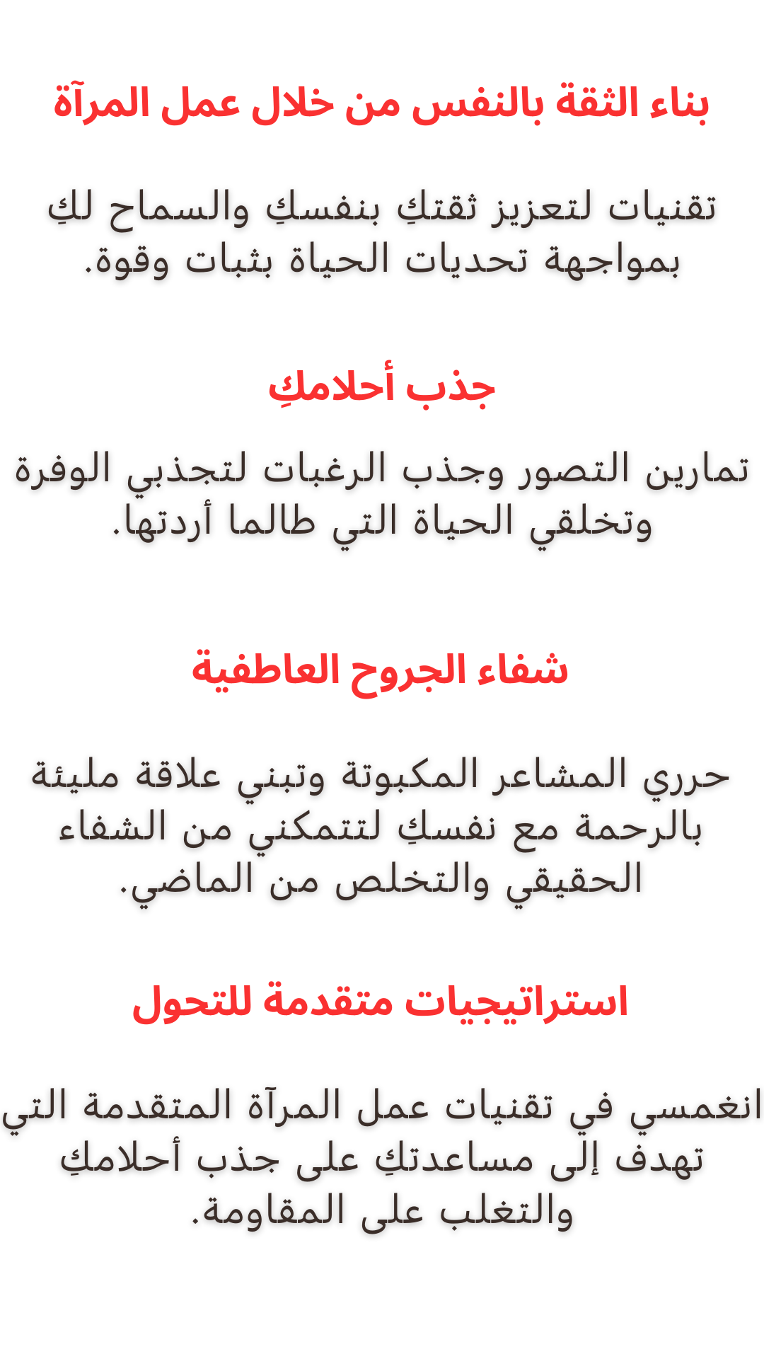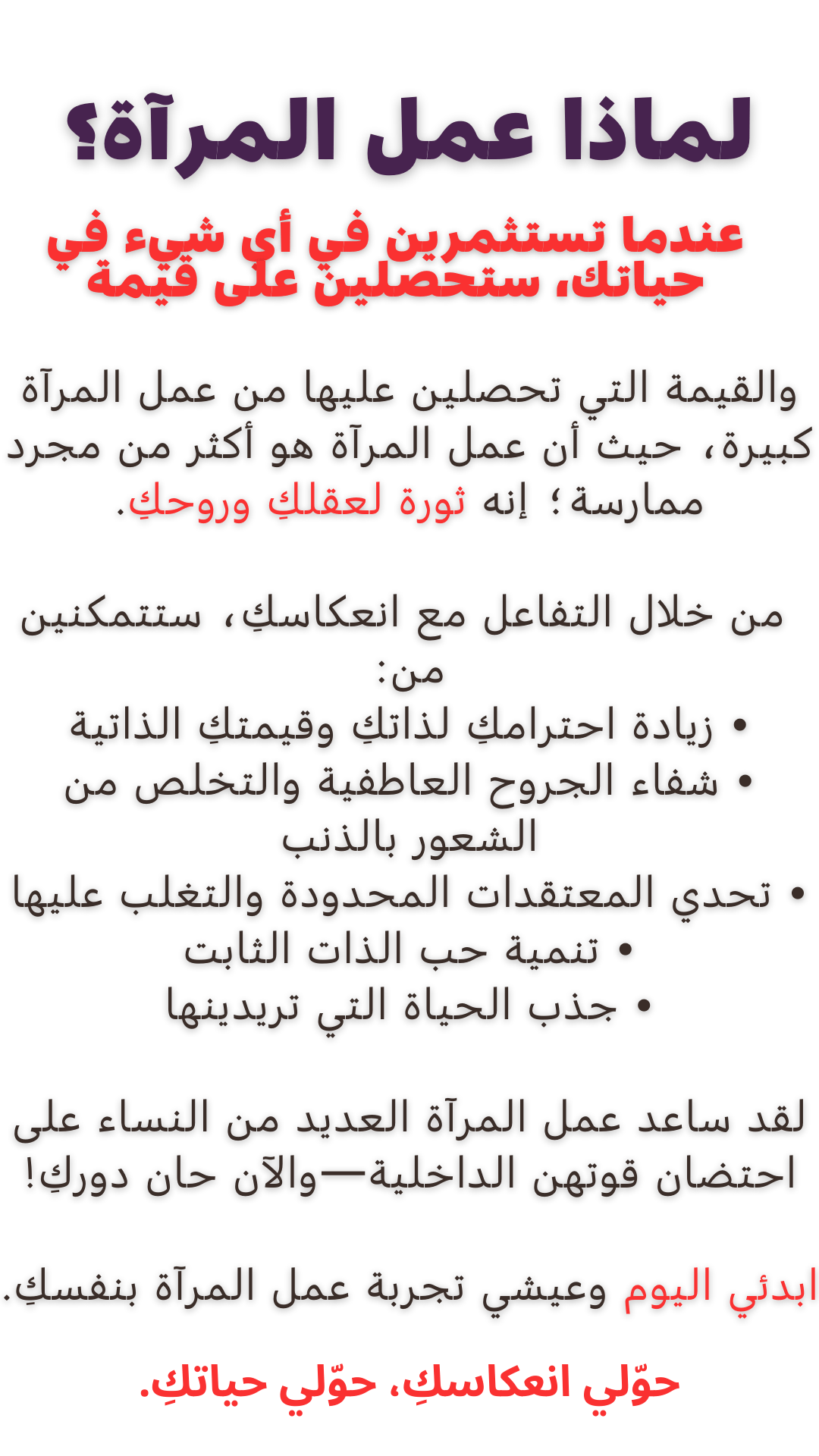 رسالتي اليوم هي مساعدة النساء في كل الوطن العربي على أن يتخطين مخاوفهن، ويتحدين معتقداتهن المحدة للوصول لحياة أحلامهن التي يستحقونها