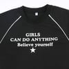 Empower the next generation with the "Believe Bodysuit" — a bold fusion of comfort, style, and purpose. This black sweatshirt-style bodysuit features a sleek fit, a unique sleeve pocket, and an inspiring message: “Girls can do anything. Believe yourself.” Designed to remind every girl she’s powerful, capable, and already enough just as she is.