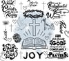 With soft watercolor blues in the background and bold black Scripture typography, the design includes crosses, a crown of thorns, a Bible, a dove, hearts, and inspiring messages that remind you of God’s love and strength.