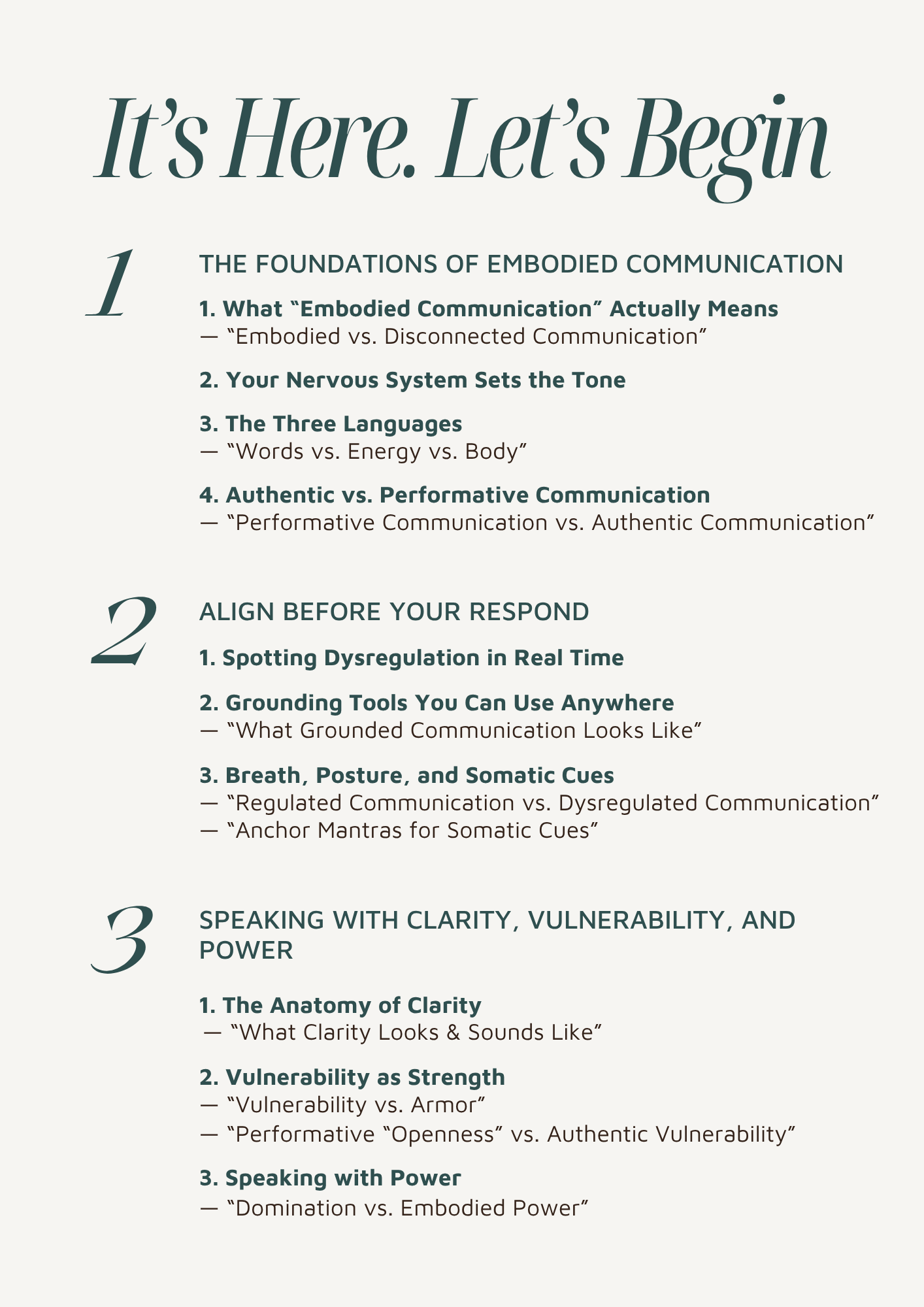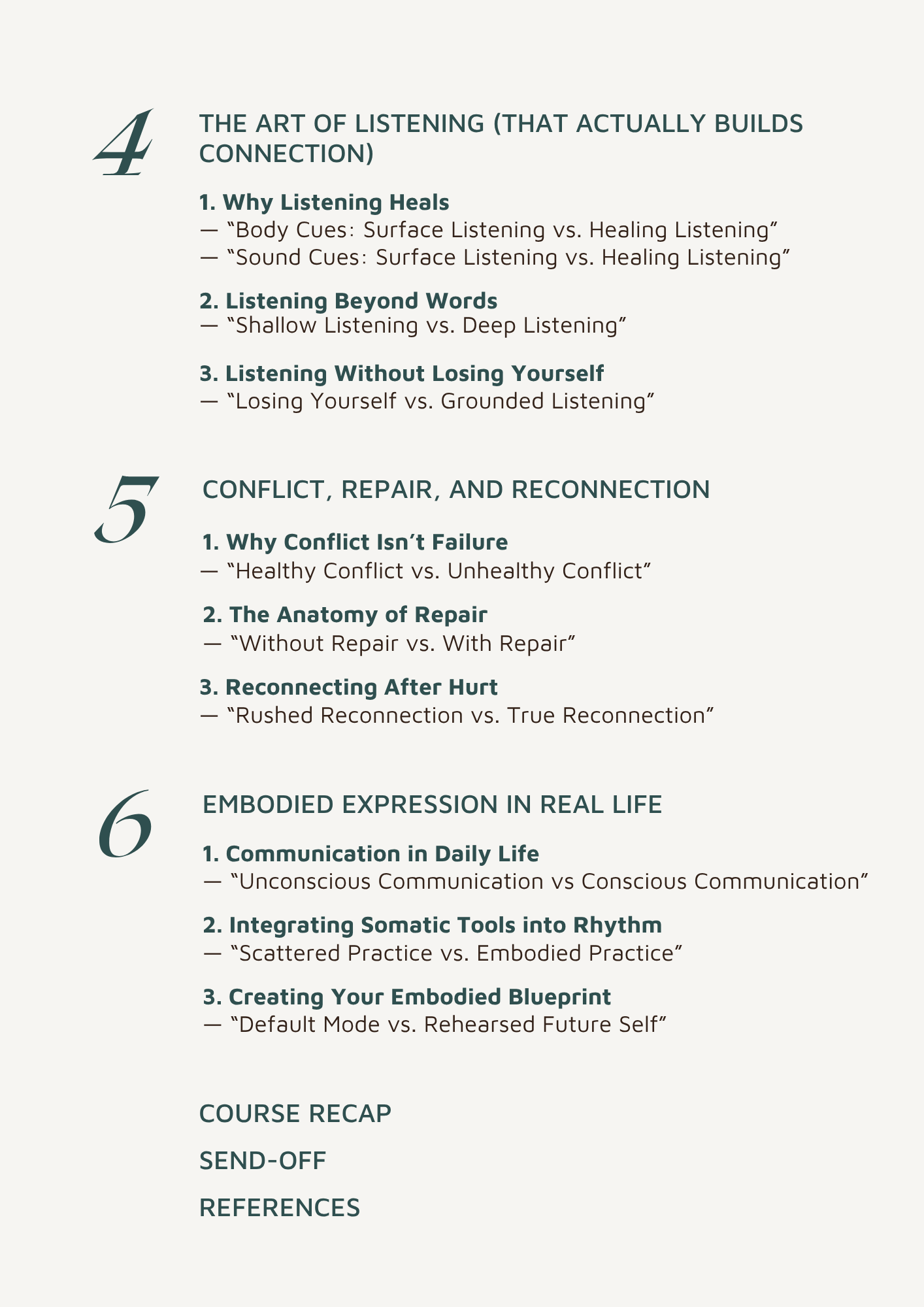 A 6-module journey for anyone ready to stop repeating old patterns and start communicating in a way that feels grounded, honest, and emotionally safe.