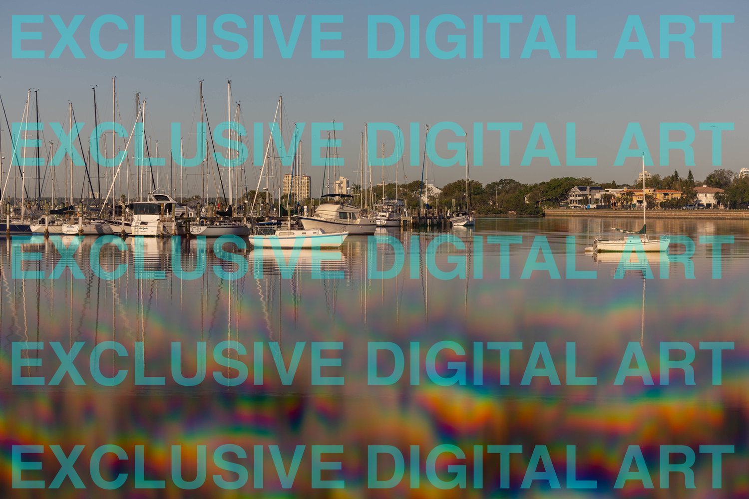 Where docked sailboats rest beneath the Florida sky, the shoreline quietly holds a dream. Captured on the serene beach of Davis Island Marina, this fine art photograph features a radiant crystal reflection cascading across sand and water — a fleeting spectrum of color born from light and glass.