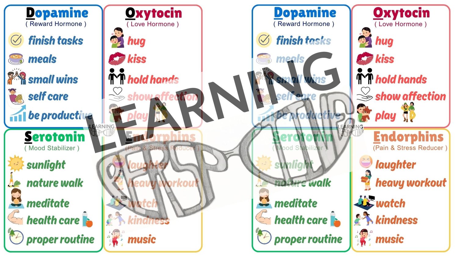 Ever wonder what could motivate a child into a task? Perhaps, it's not the motivation (bribe or reward after). Perhaps, it's the mood the body and mind could prepare for entering into a (non)preferred task. For example, taking a brief walk around the block immediately before performing a learning lesson has reduced our frustration response each time we get a dose of frustration. You'll be able to come up with your own specific strategies once you gain awareness on Dopamine/Oxytocin/Serotonin/Endorphin and understand to speak in these terms to make choices of your first/next activity together. This visual will help remind you of the needed options for your daily D.O.S.E.
