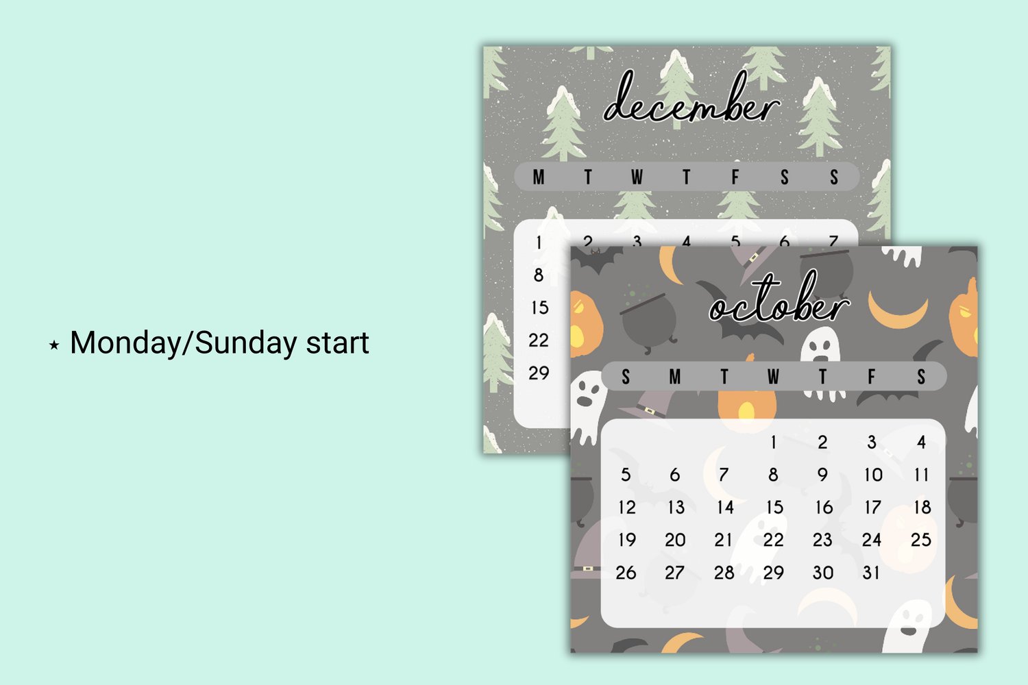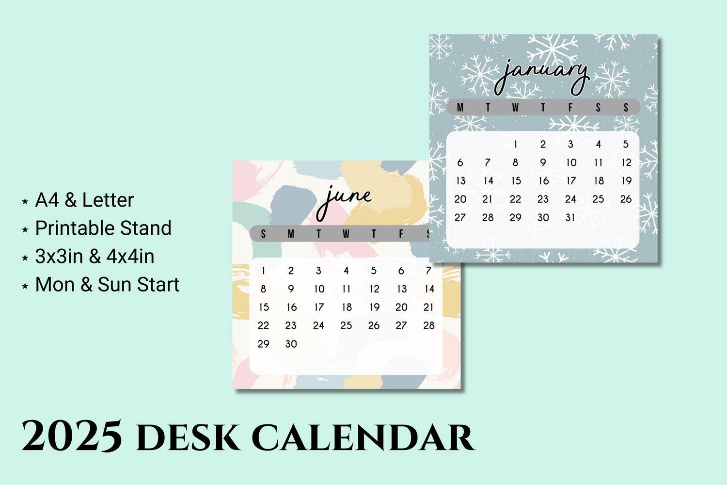 This calendar comes in two sizes: 3x3 and 4x4 inches, each in A4 and Letter formats ready to print. It also includes two versions: Monday or Sunday start.