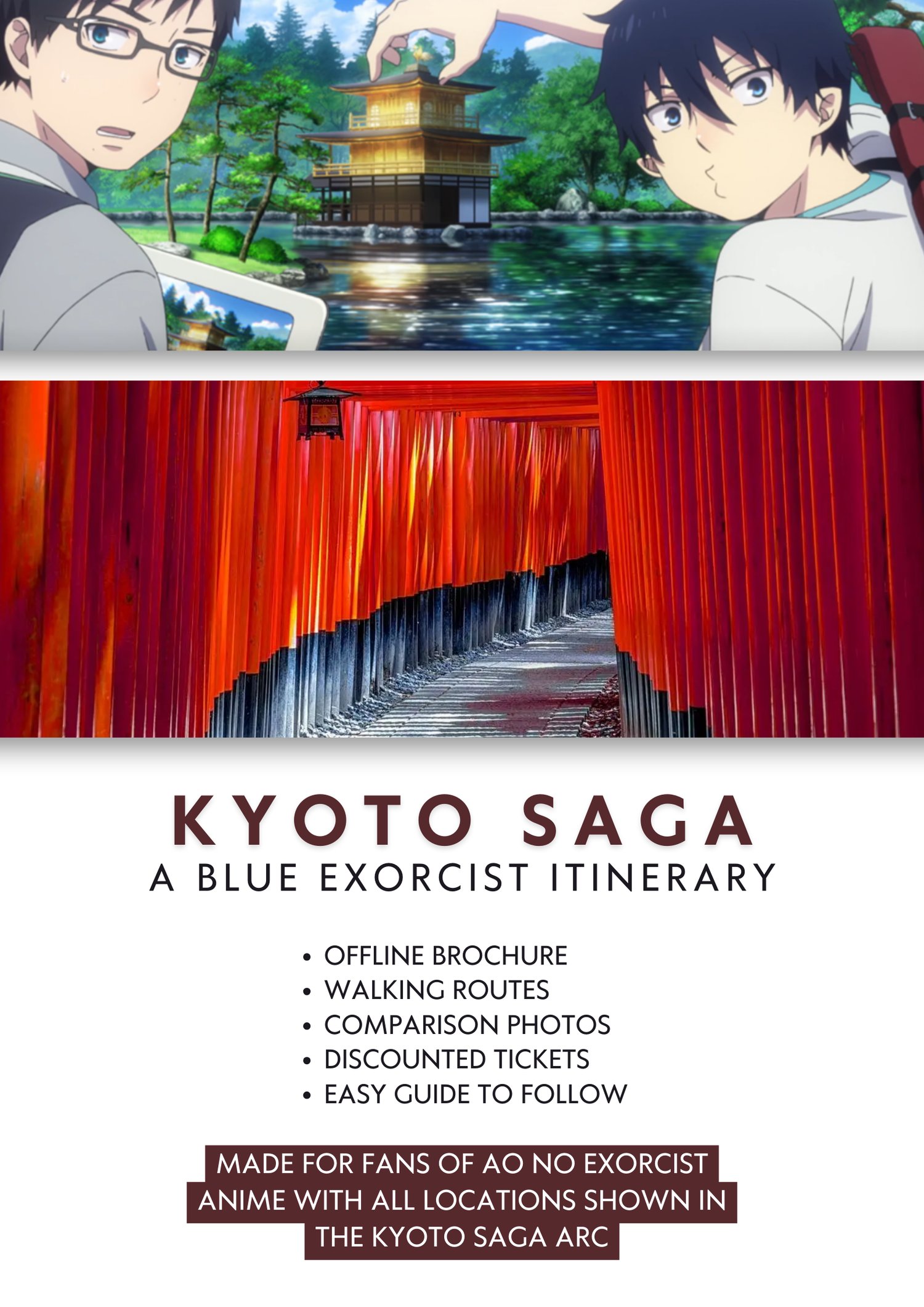 This downloadable 2-Day Kyoto itinerary is made for fans who want to explore the real locations in Blue Exorcist Kyoto Saga without confusions or hassles. The ready to use Kyoto guide has: