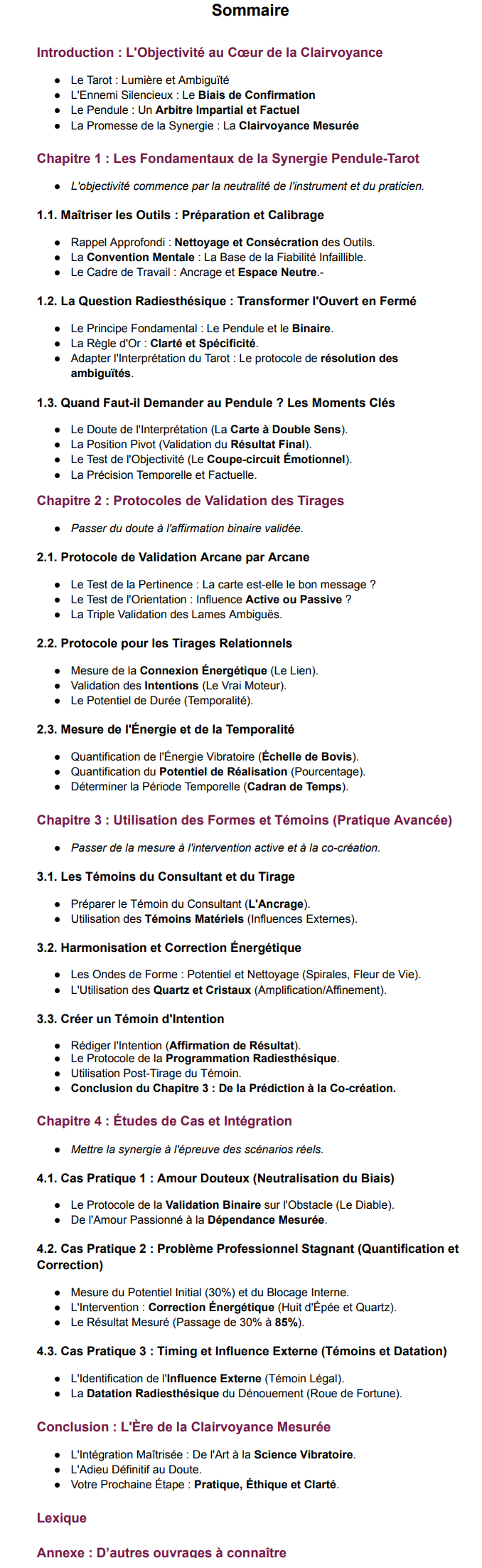 L'e-book "Tarot & Pendule : La Clairvoyance Mesurée" est le seul guide qui fusionne l'Intuition et la Précision Factuelle. Vous apprendrez à mesurer le vrai, le potentiel (en pourcentage) et le timing exact. Éliminez le Biais de Confirmation et gagnez une Confiance Absolue dans vos lectures.