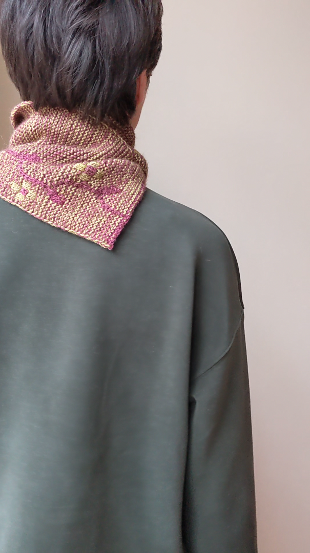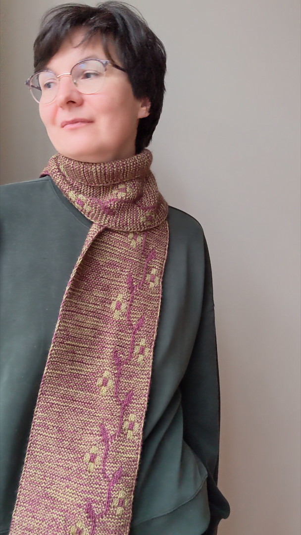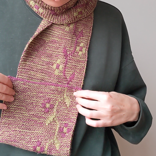 The Tendril Tapestry Scarf is a reversible design featuring a simple double-knit floral motif set against a cozy garter stitch background.