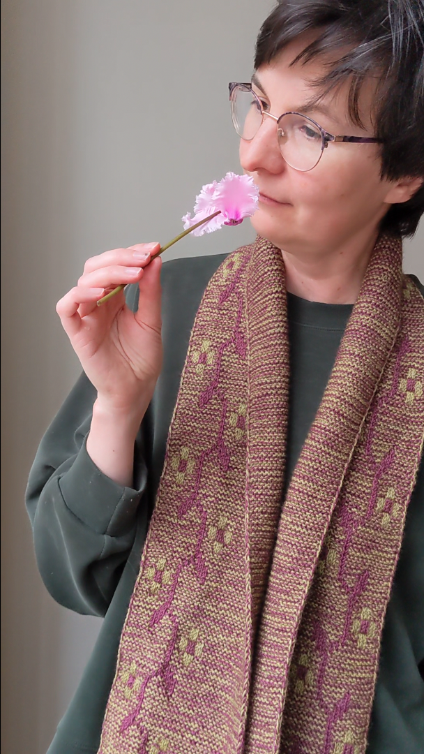 This pattern continues the Daisy Chain series, sharing a similar floral motif. However, unlike previous patterns in the series where the motif was worked along the garter ridges, the Tendril Tapestry Scarf motif grows perpendicular to the ridges and includes delicate leaf elements. This new direction gives the fabric a fresh dynamic, creating a smoother, wavy line and a more realistic look for the stem.