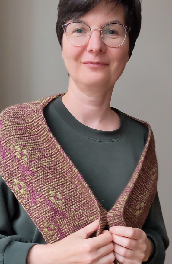 The shown sample was knit with Lumoava Jakki by Nettilanka (60% SW Merino, 20% Silk, 20% Yak; 437 yds (366m) /100g) in colourways Kymppi and Violetti.
