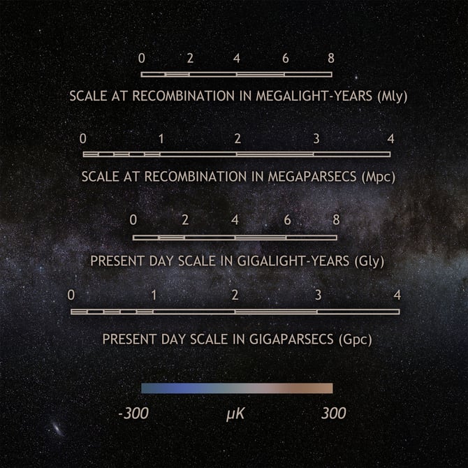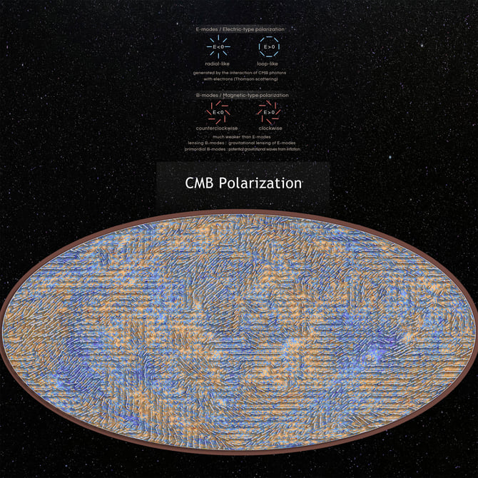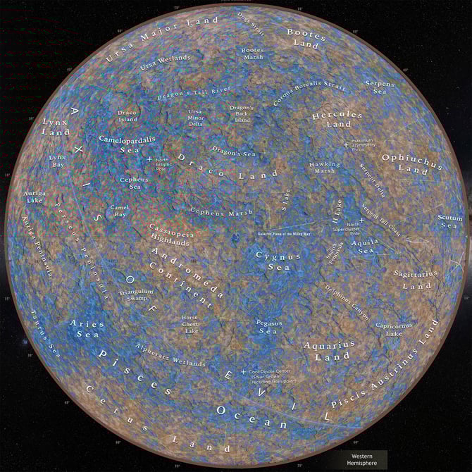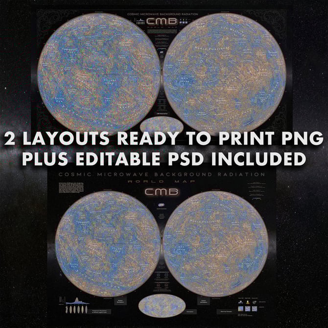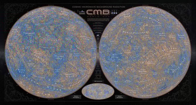 Presented as a world map, the Cosmic Microwave Background (CMB), or primordial radiation, is dissected into a geophysical-style layout. Features are named like continents and seas, inspired by the constellations beneath them. A gradient of blues and browns represents temperature variations, set against a dark, starry backdrop. Surrounding details and infographics complement the main map. Data credit ESA and Planck Collaboration. Map idea and realization Pablo C. Budassi in May 2025.