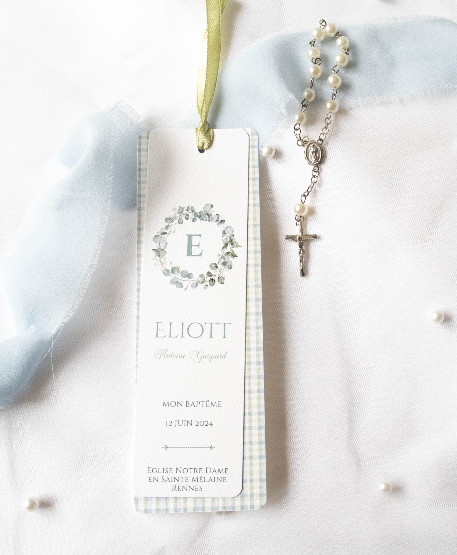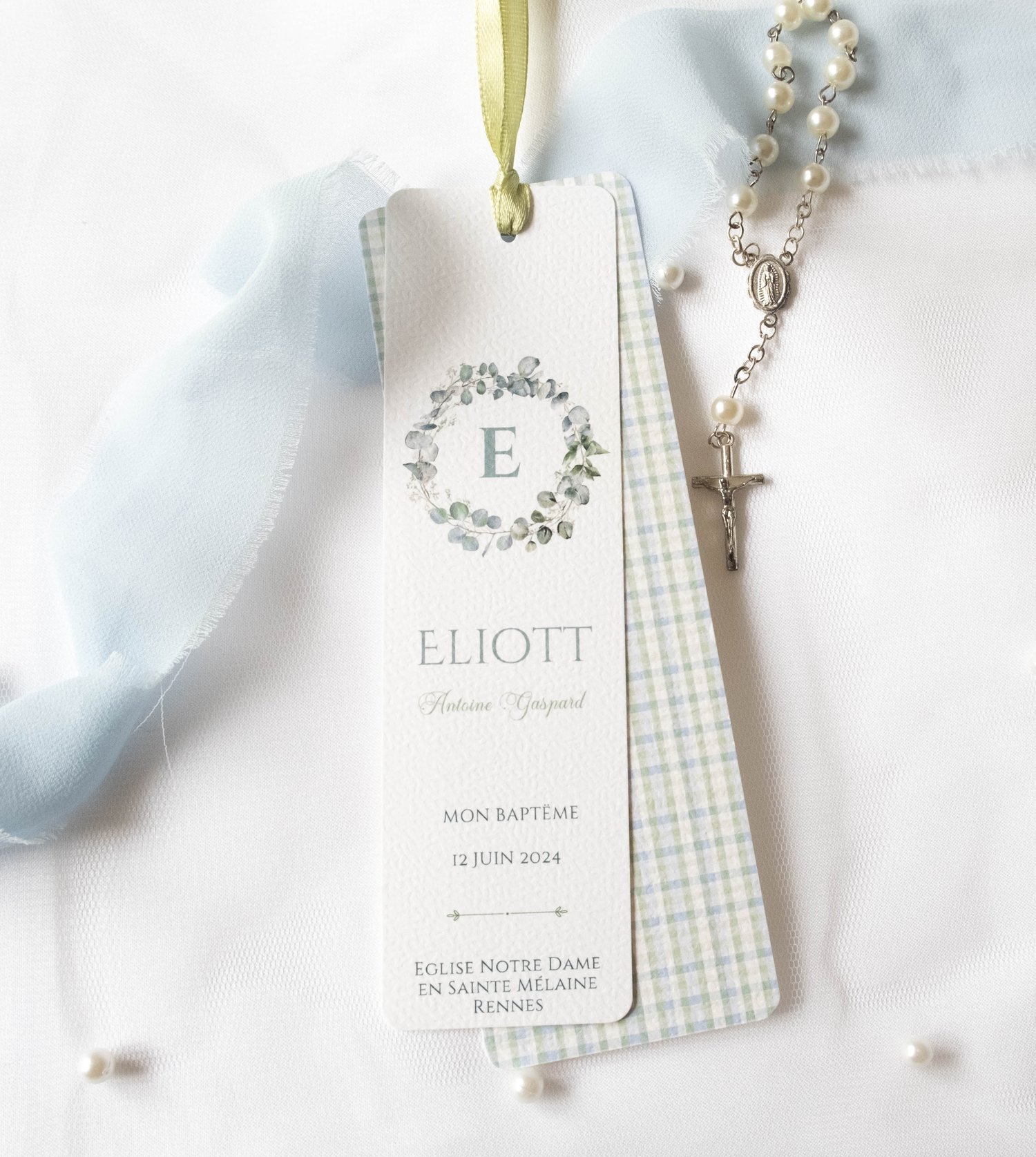 Sur le volet supérieur, l’initiale de l’enfant est mise en valeur au centre d’une délicate couronne d’eucalyptus. Viennent ensuite le prénom, et si souhaité, les deuxièmes et troisièmes prénoms. En dessous, une petite croix, la date et le lieu de la cérémonie viennent ponctuer ce souvenir unique.