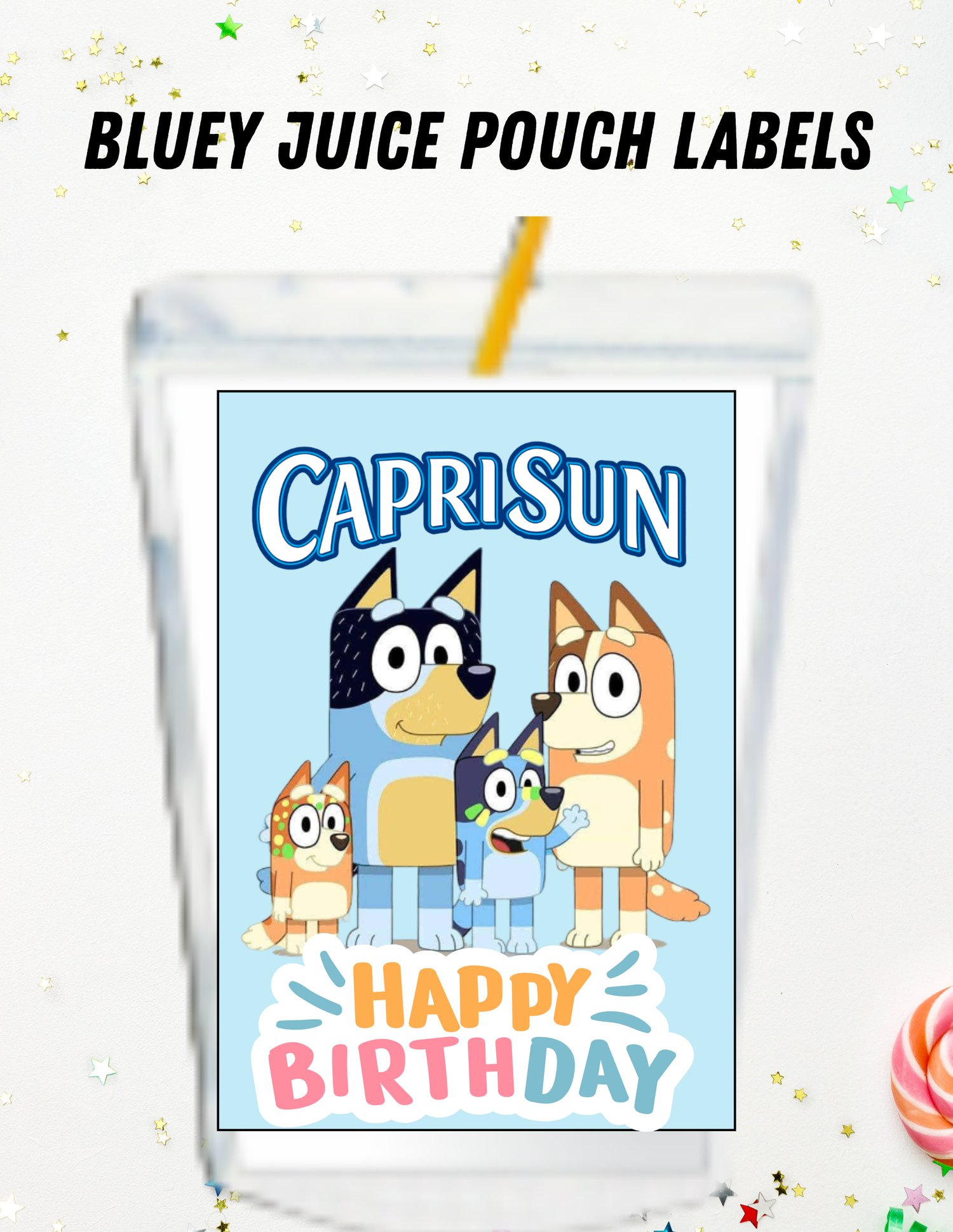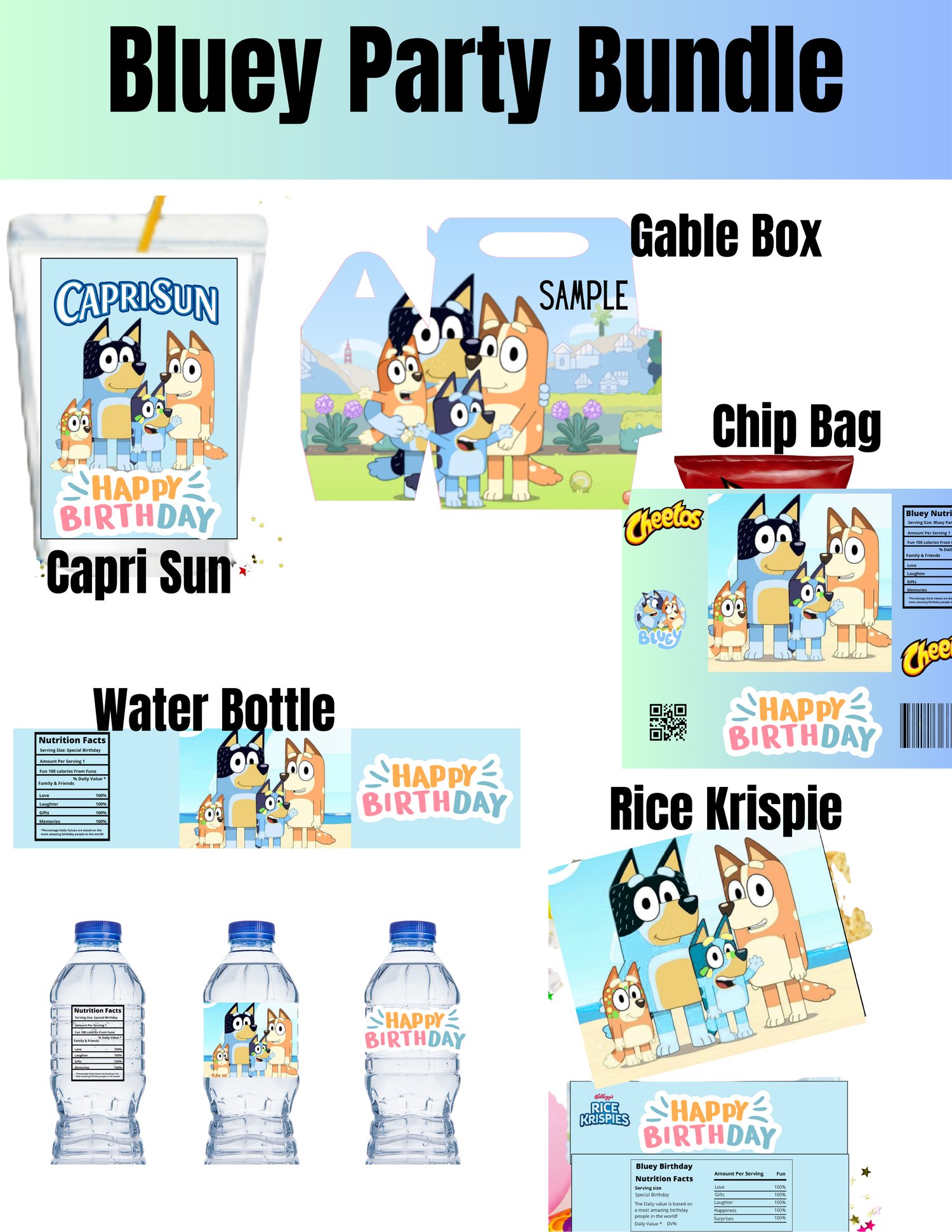 Create the perfect birthday celebration with this Bluey themed printable party bundle! Designed to make party planning easy and fun, this complete DIY favor set allows you to quickly transform snacks and drinks into adorable custom party treats your guests will love.