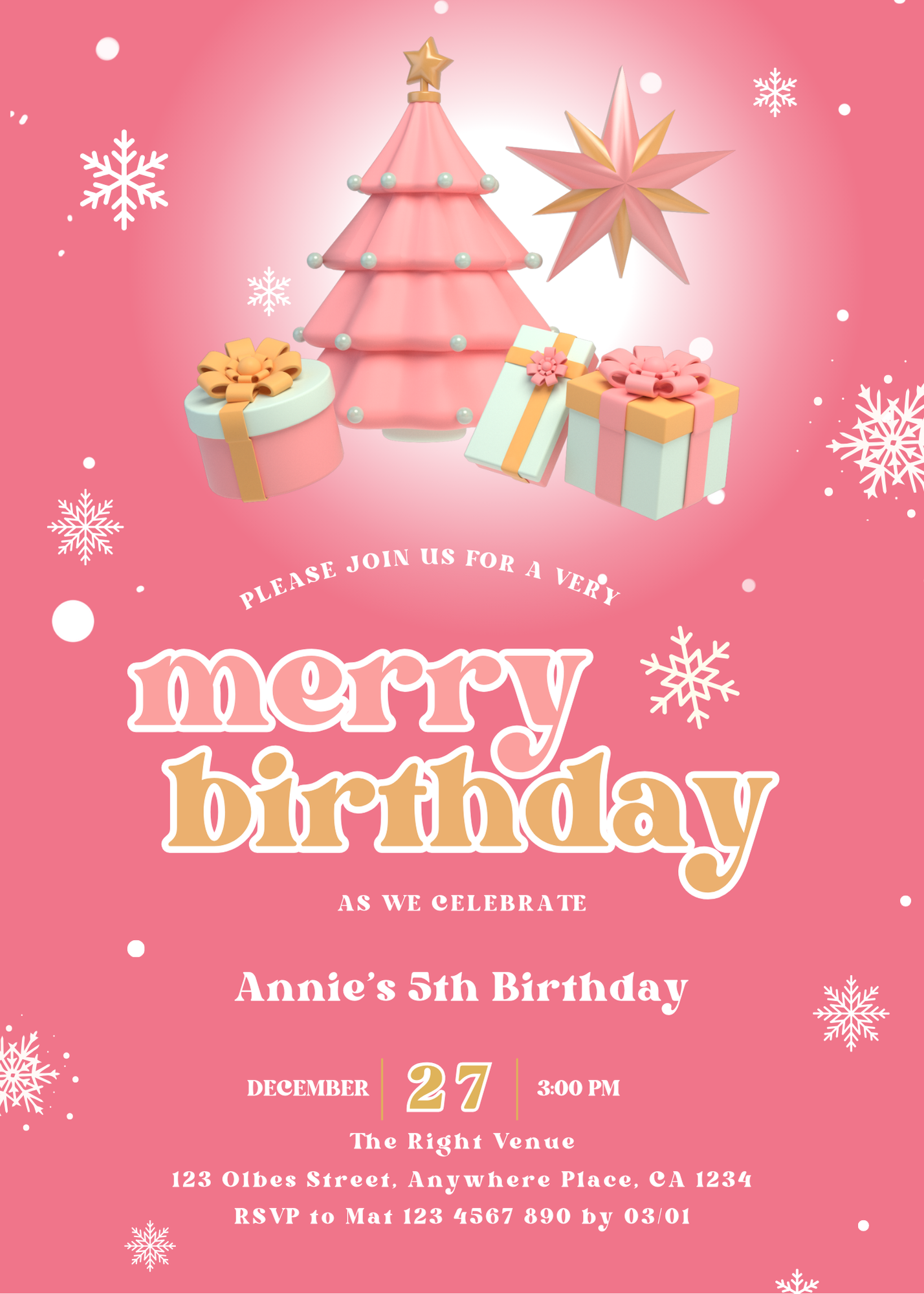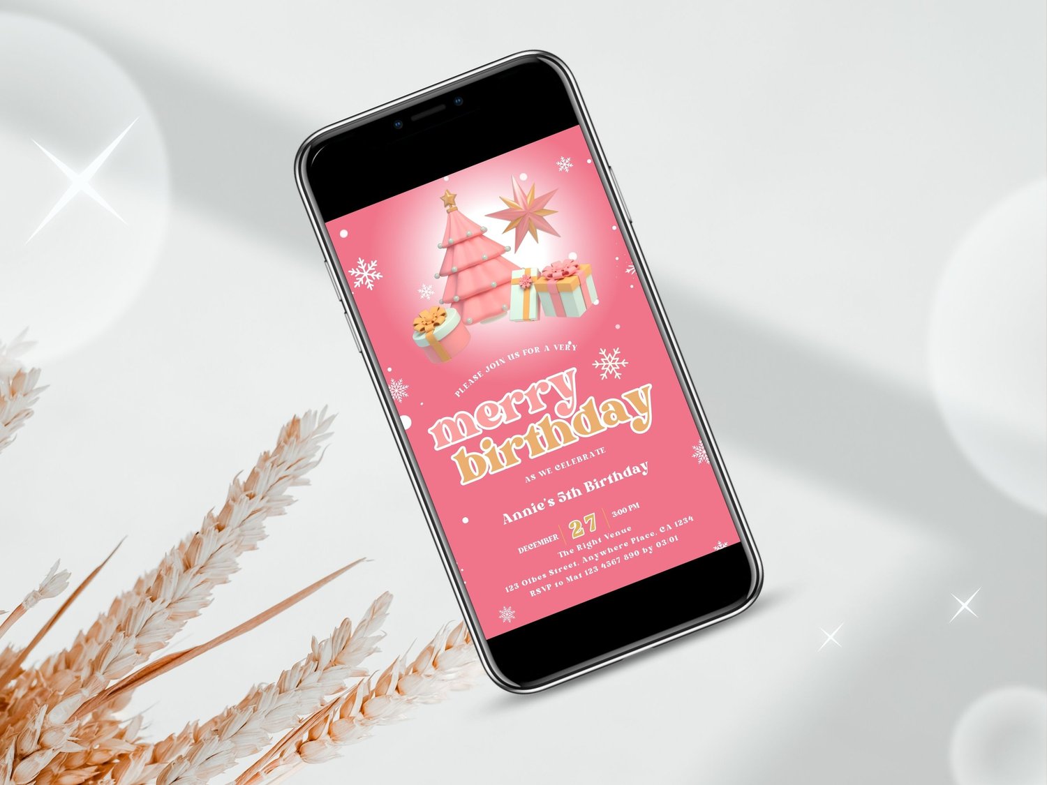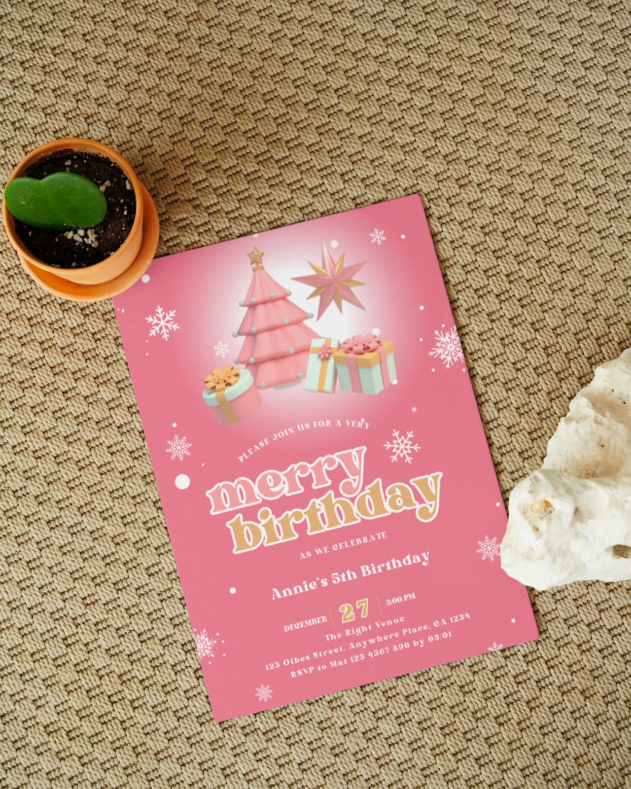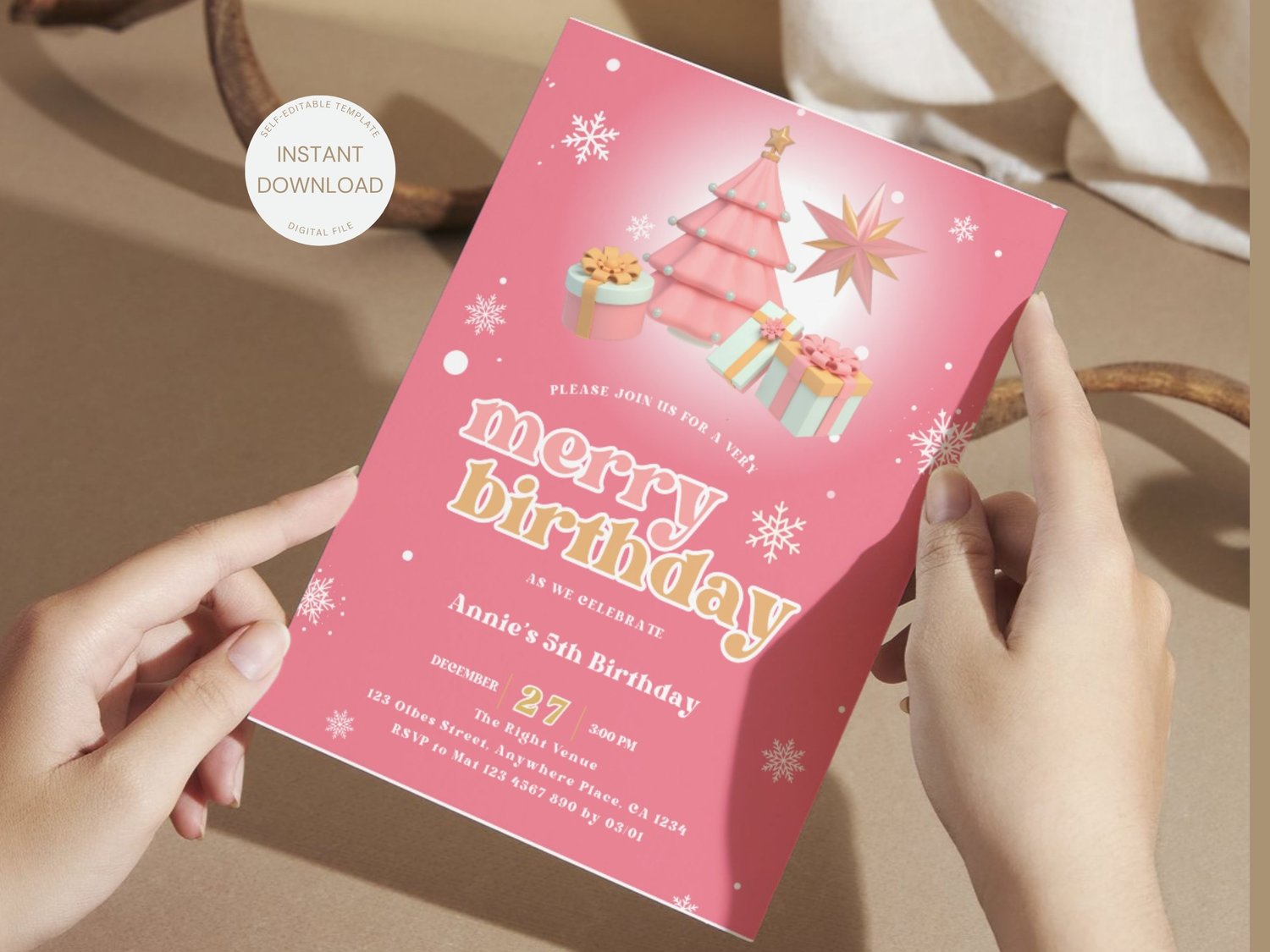 Pink Very Merry Birthday Invitation Template, Girl Christmas Birthday Invite, Editable Pink Holiday Birthday for Kids and Teens