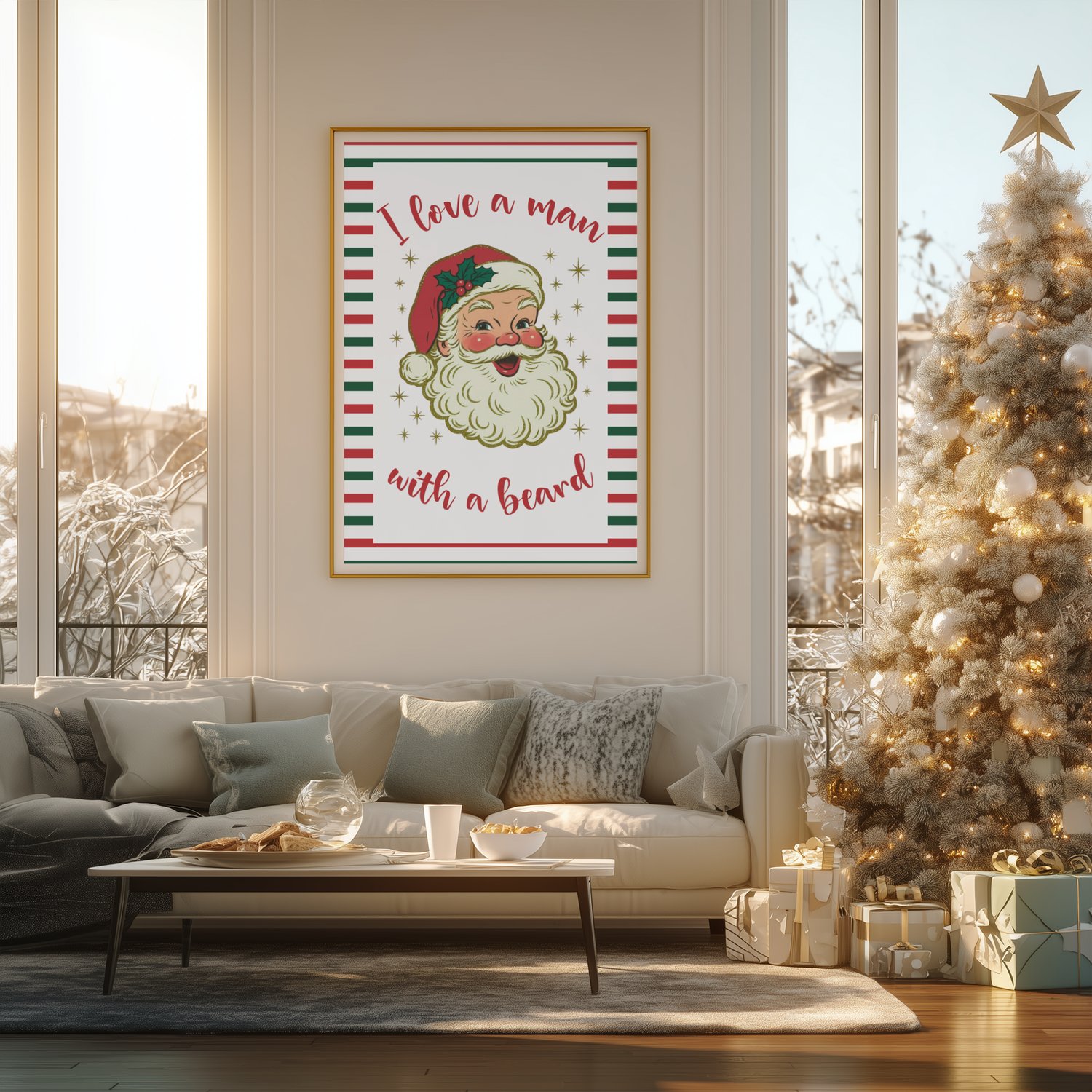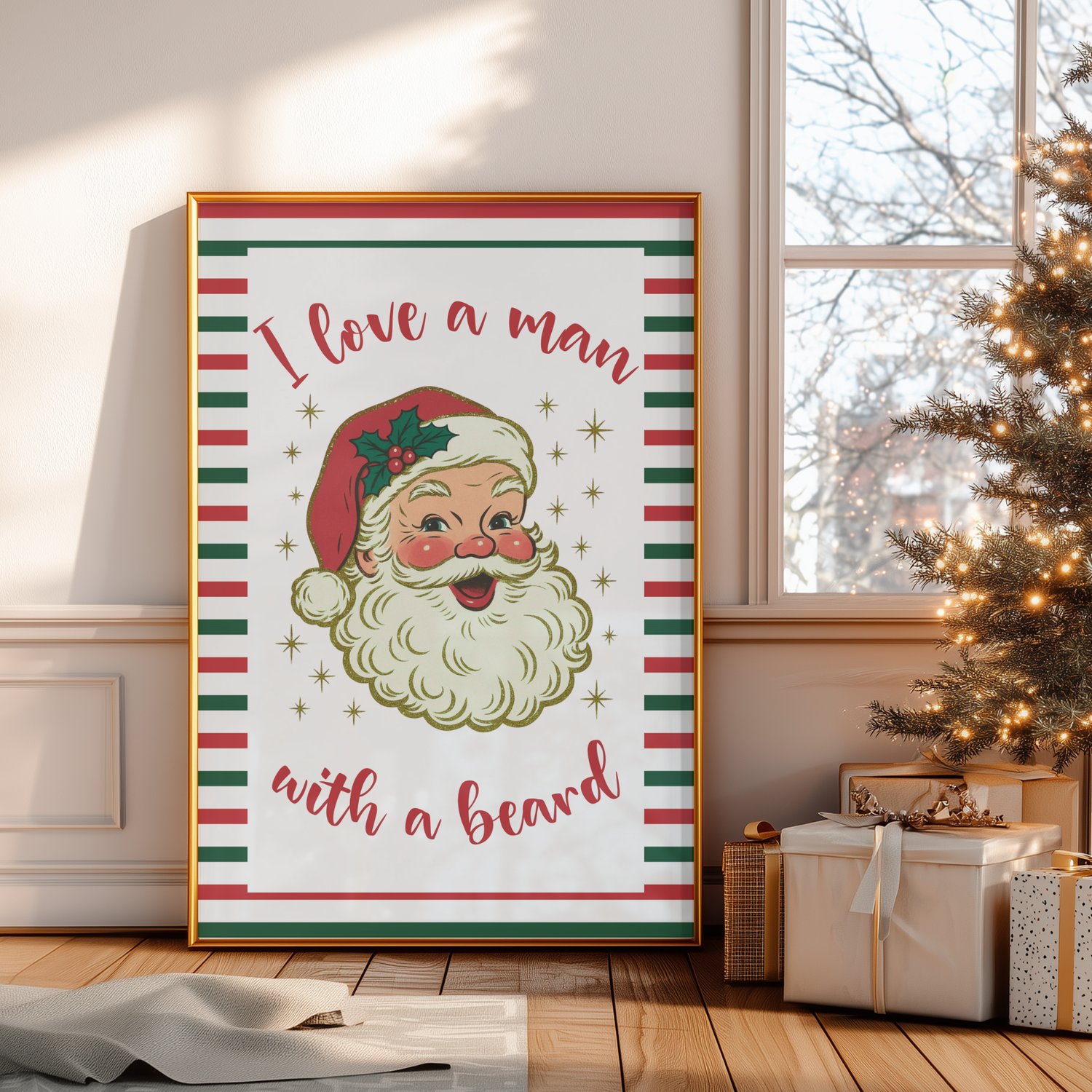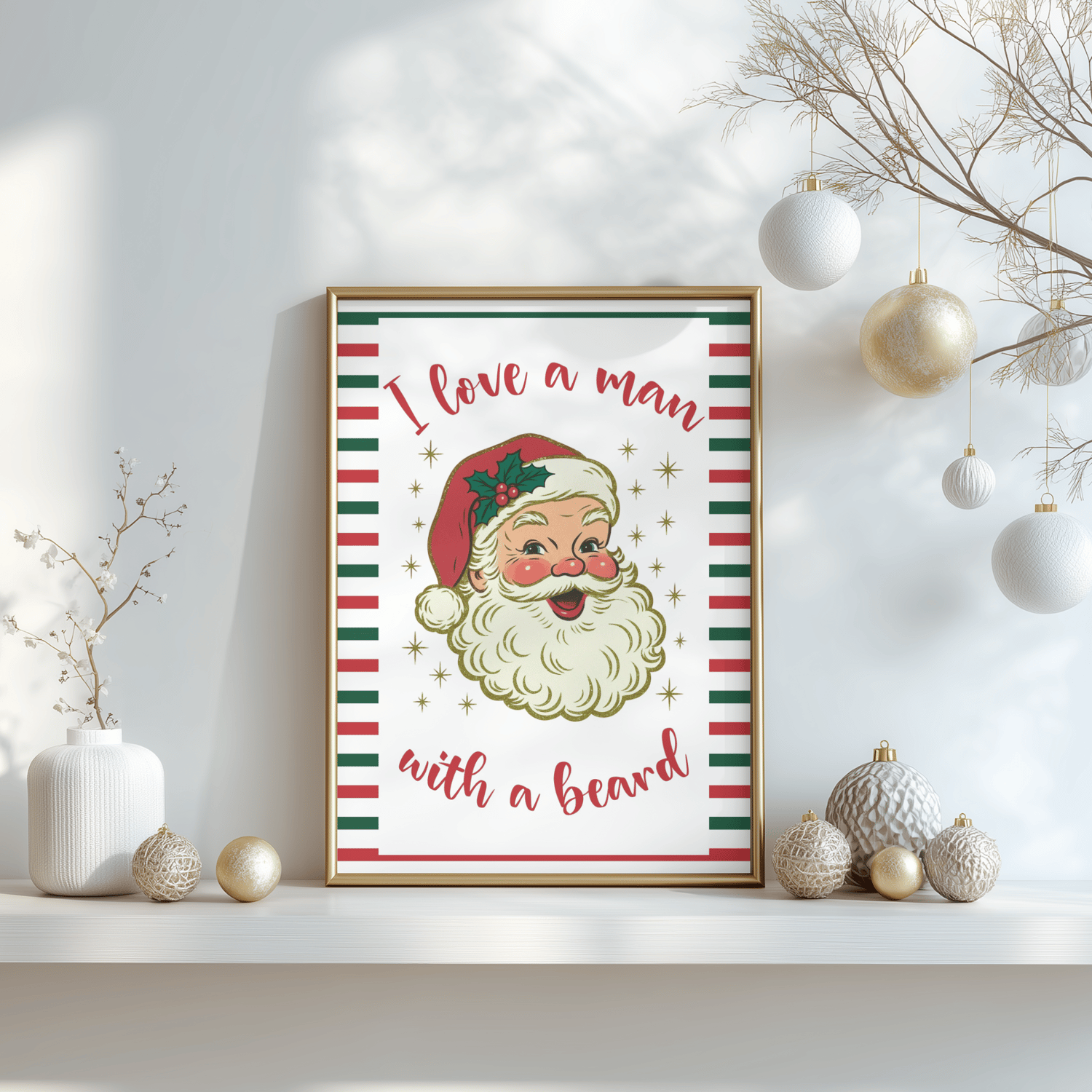 Bring festive cheer to your home with this adorable retro Santa printable featuring the funny holiday quote: “I Love a Man With a Beard.” This vintage-style Christmas wall art adds warmth, humor, and nostalgic charm to any room — perfect for living rooms, entryways, kitchens, or holiday parties.