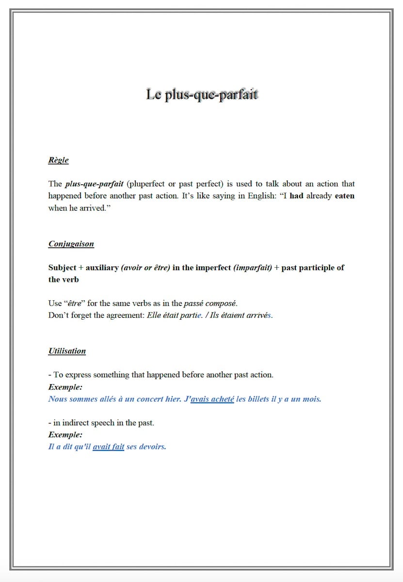 A worksheet to learn or revise the pluperfect tense (plus-que-parfait).
