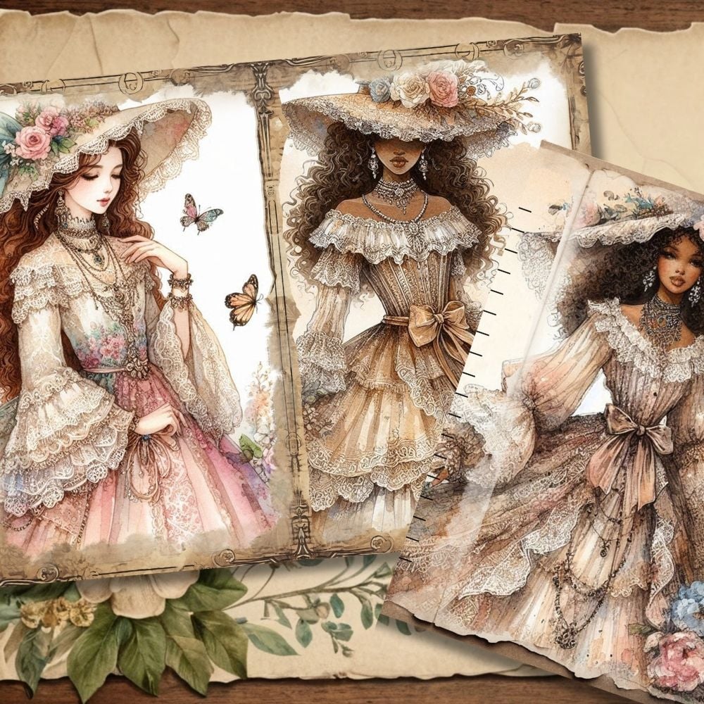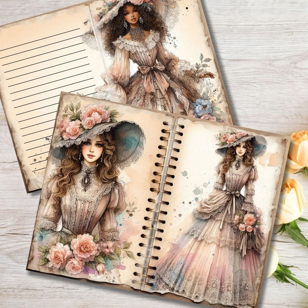 This exquisite set features 12 high-resolution JPG pages (300 DPI) adorned with graceful Victorian women, intricate lace details, and vintage floral accents. Designed in horizontal letter-size format (8.5x11"), these pages bring classic sophistication to your creative projects.