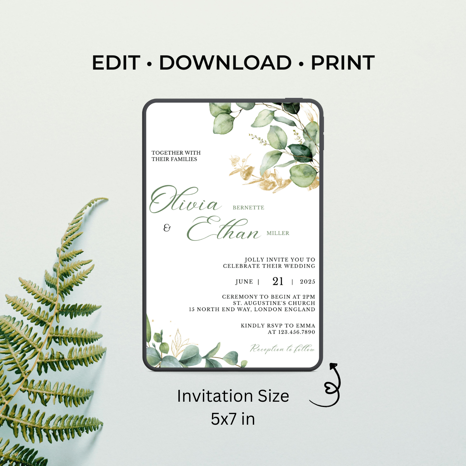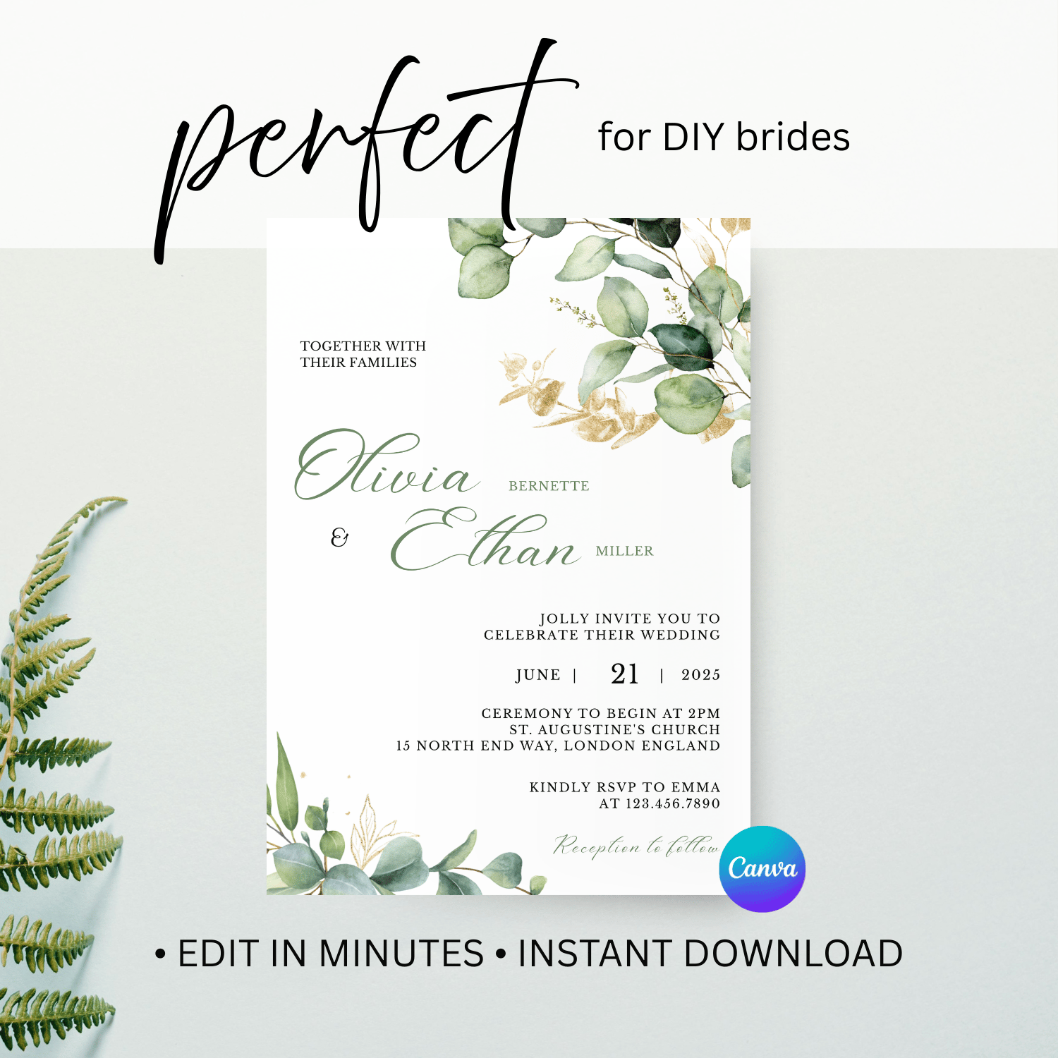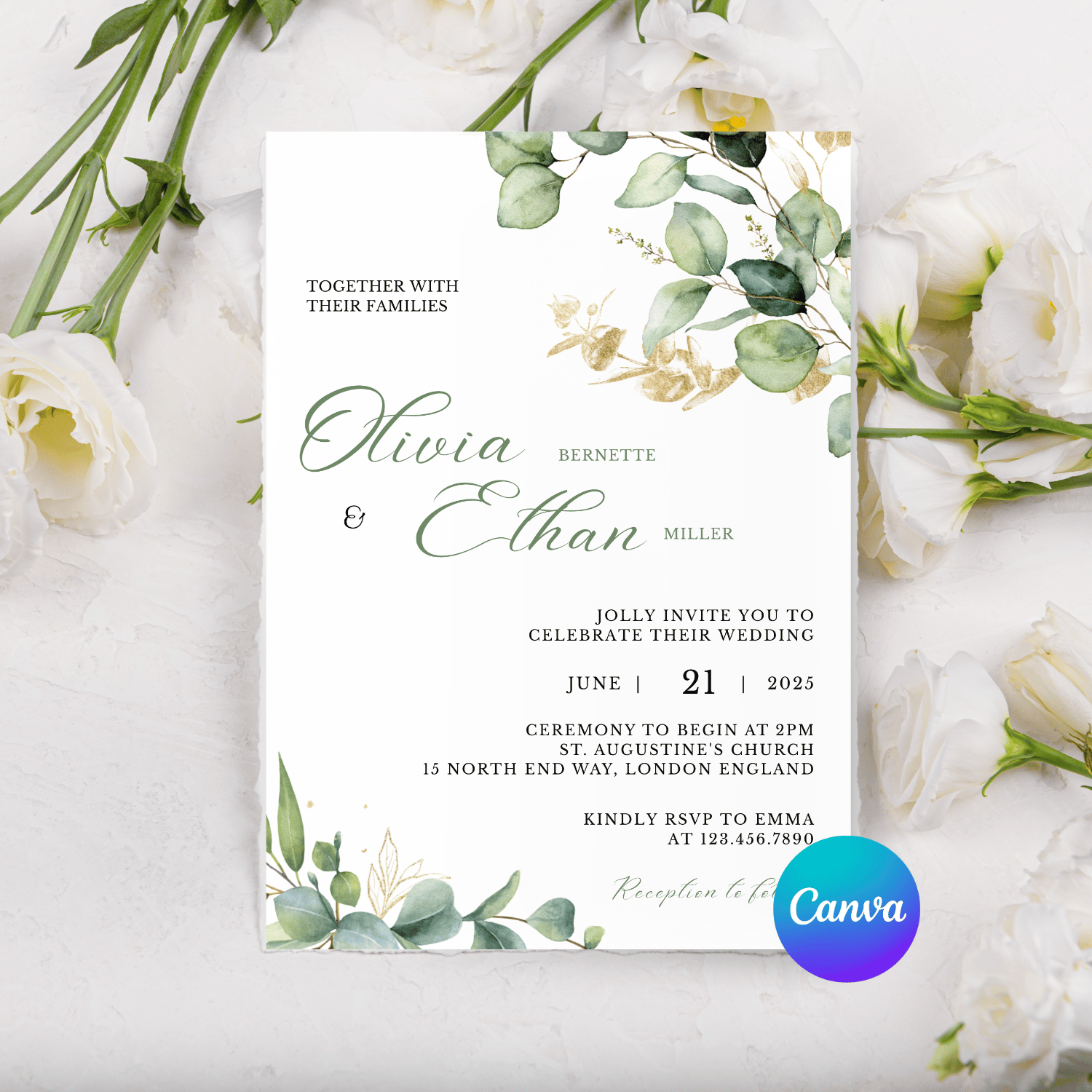 W006 Editable Green Eucalyptus Wedding Invitation Template | Botanical Canva Wedding Invite | Instant Download