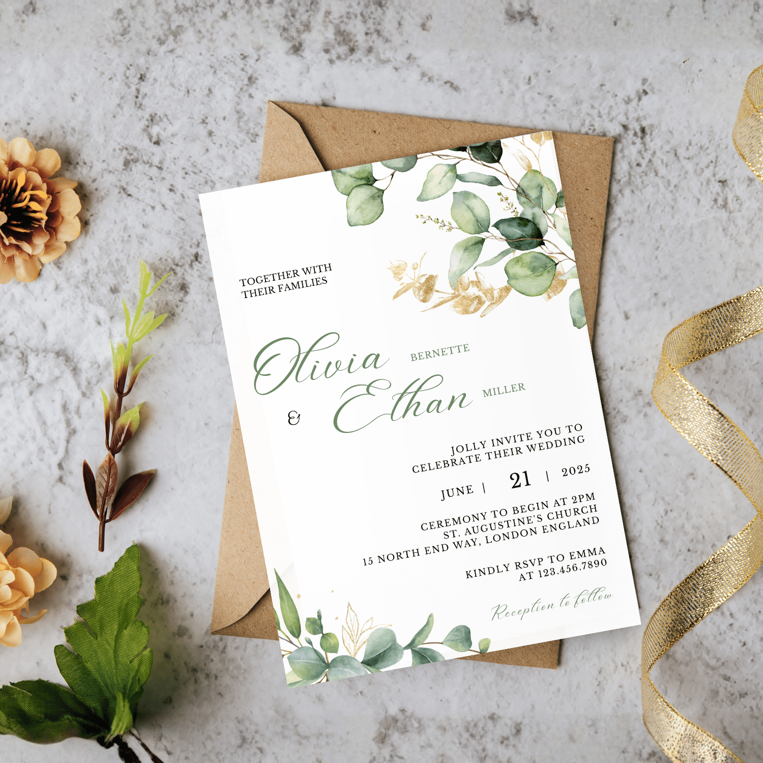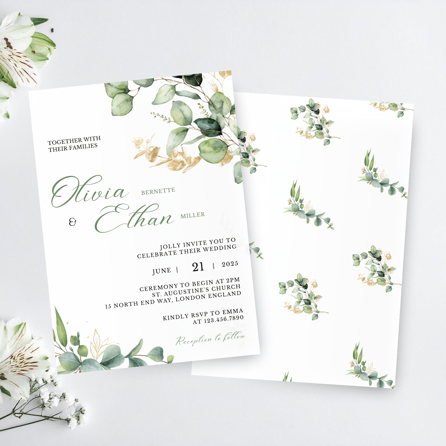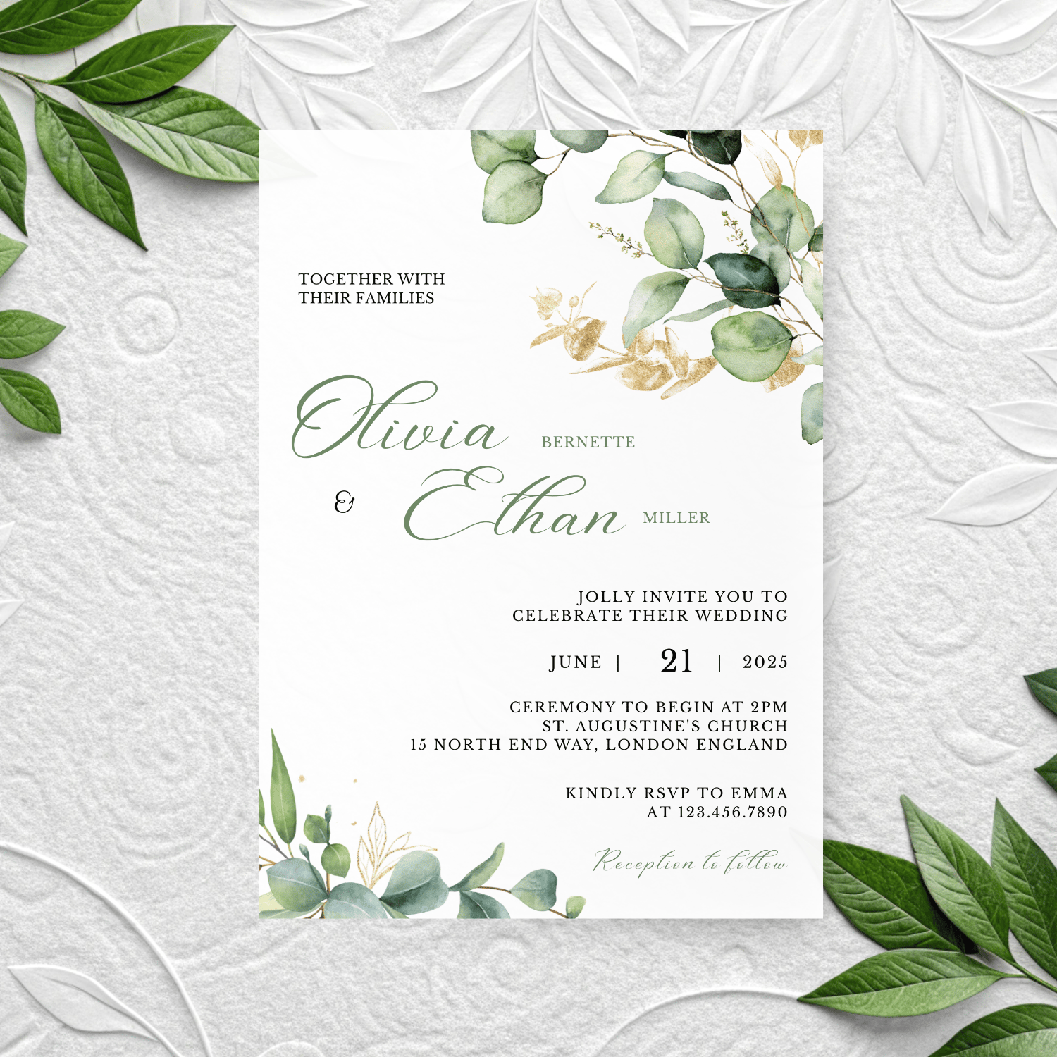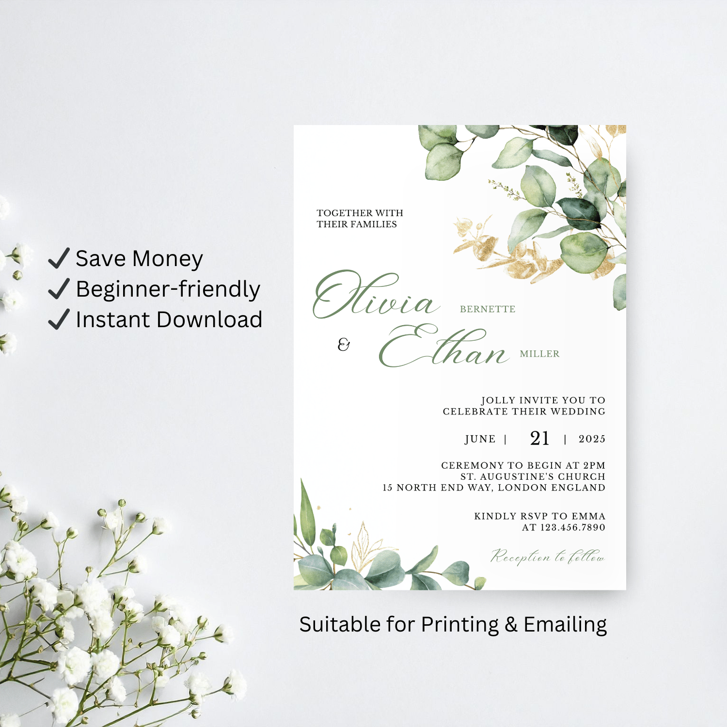 W006 Editable Green Eucalyptus Wedding Invitation Template | Botanical Canva Wedding Invite | Instant Download