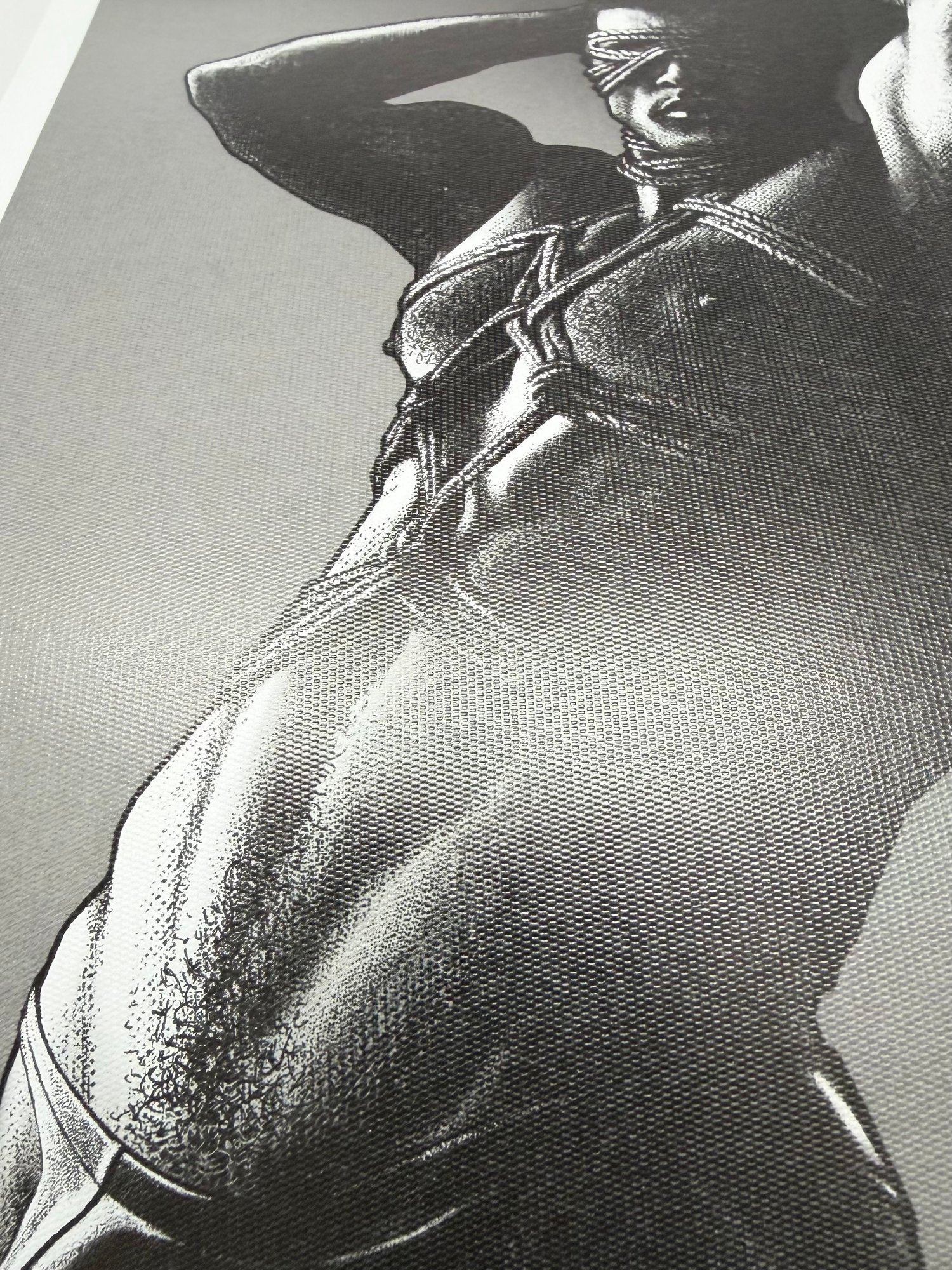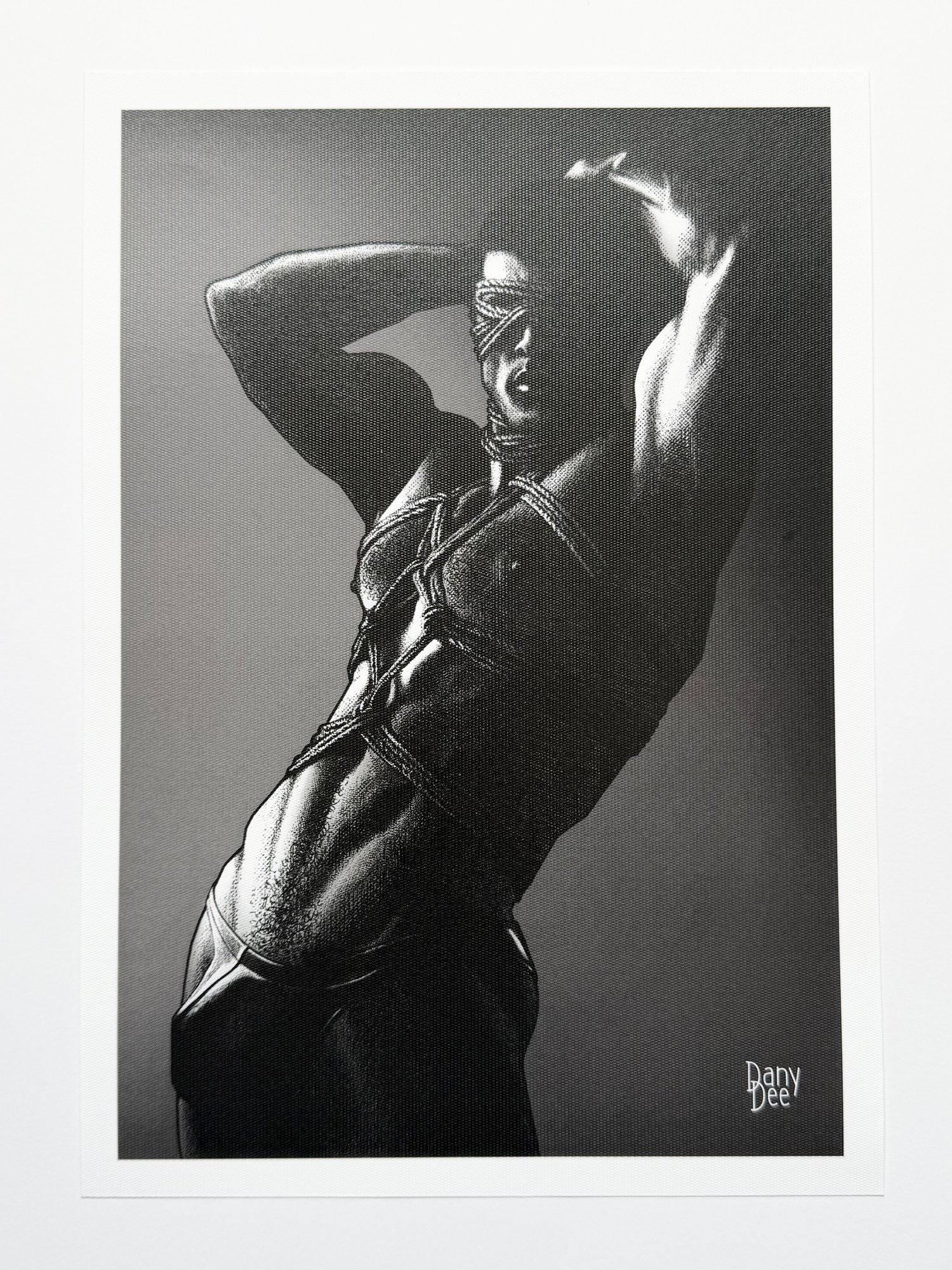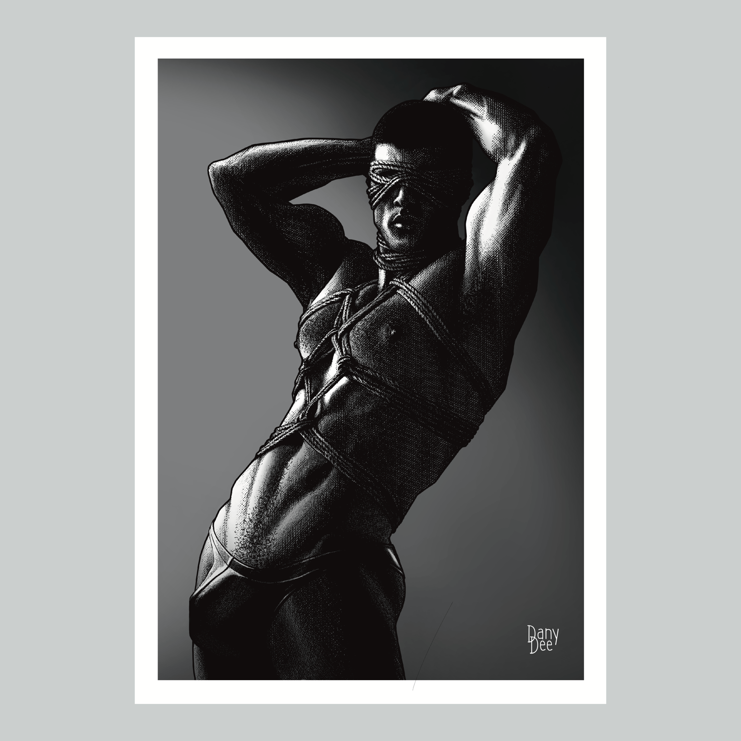 "The Rope No. 2" is a hand-drawn, monochromatic A4 art print celebrating shibari bondage culture — a bold homoerotic illustration of a powerfully built blindfolded man with arms raised in intricate rope bondage, perfect for gay bondage art collectors or queer home decor.