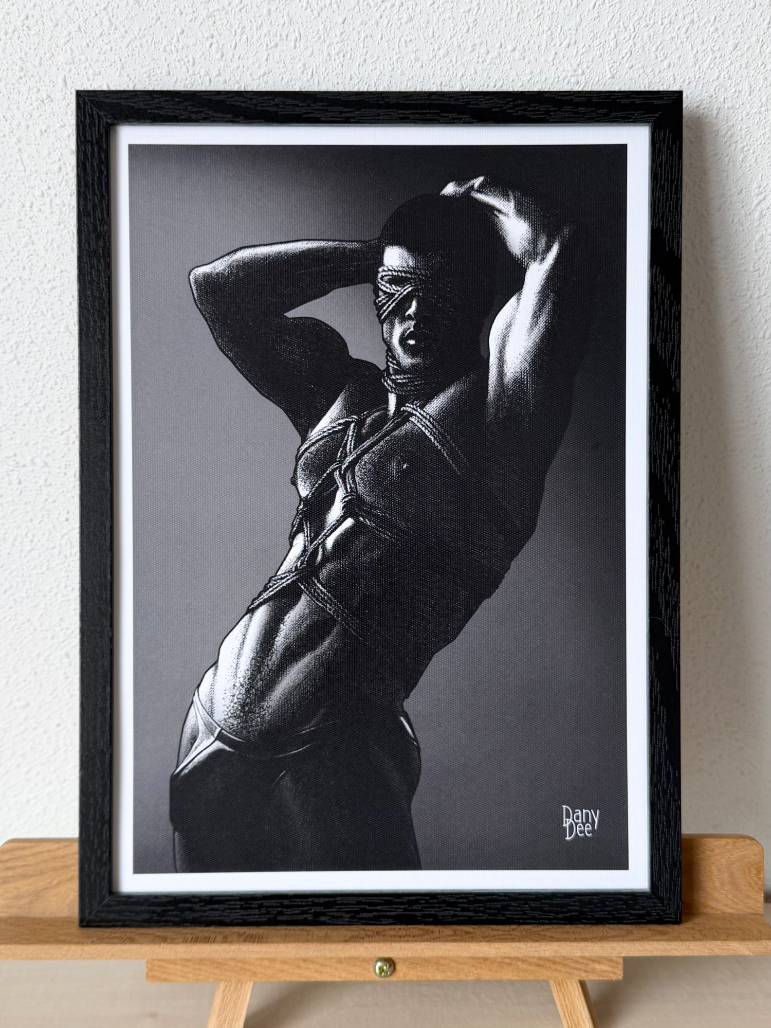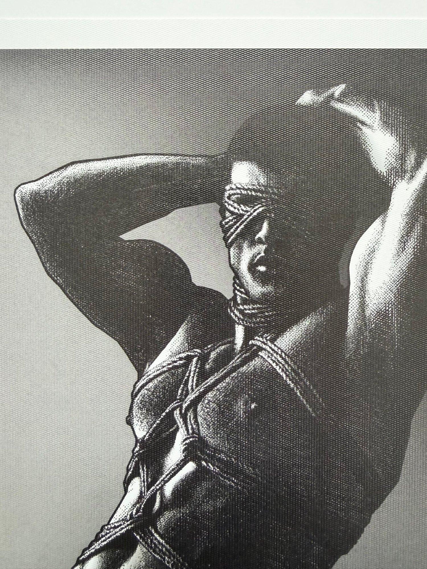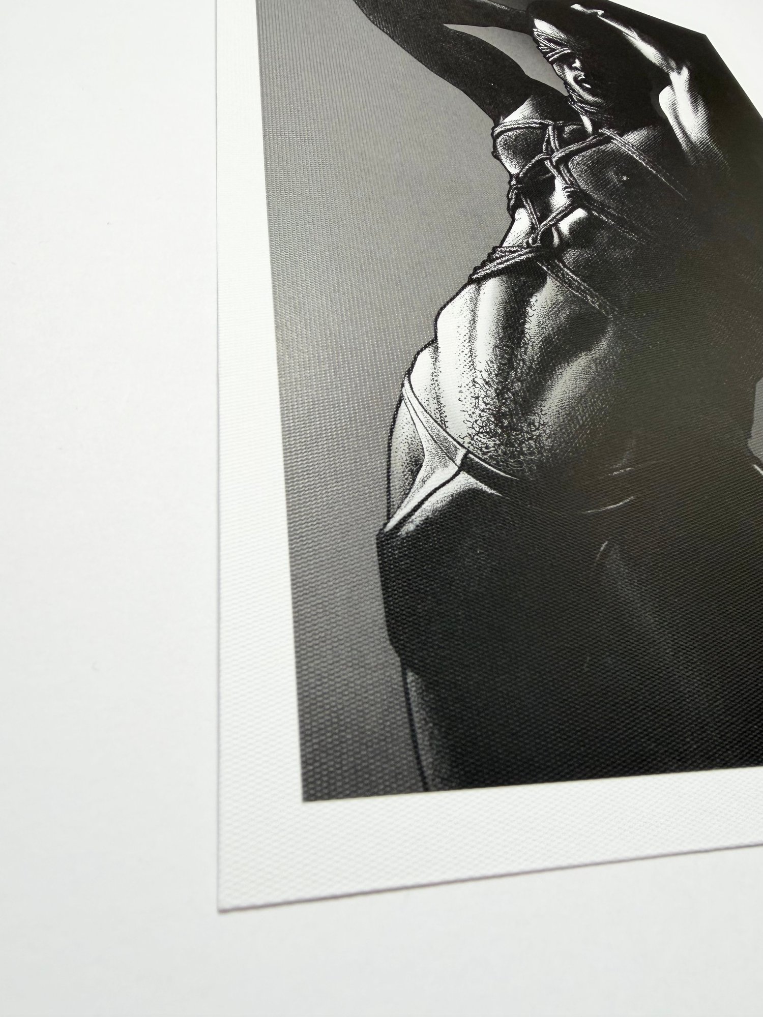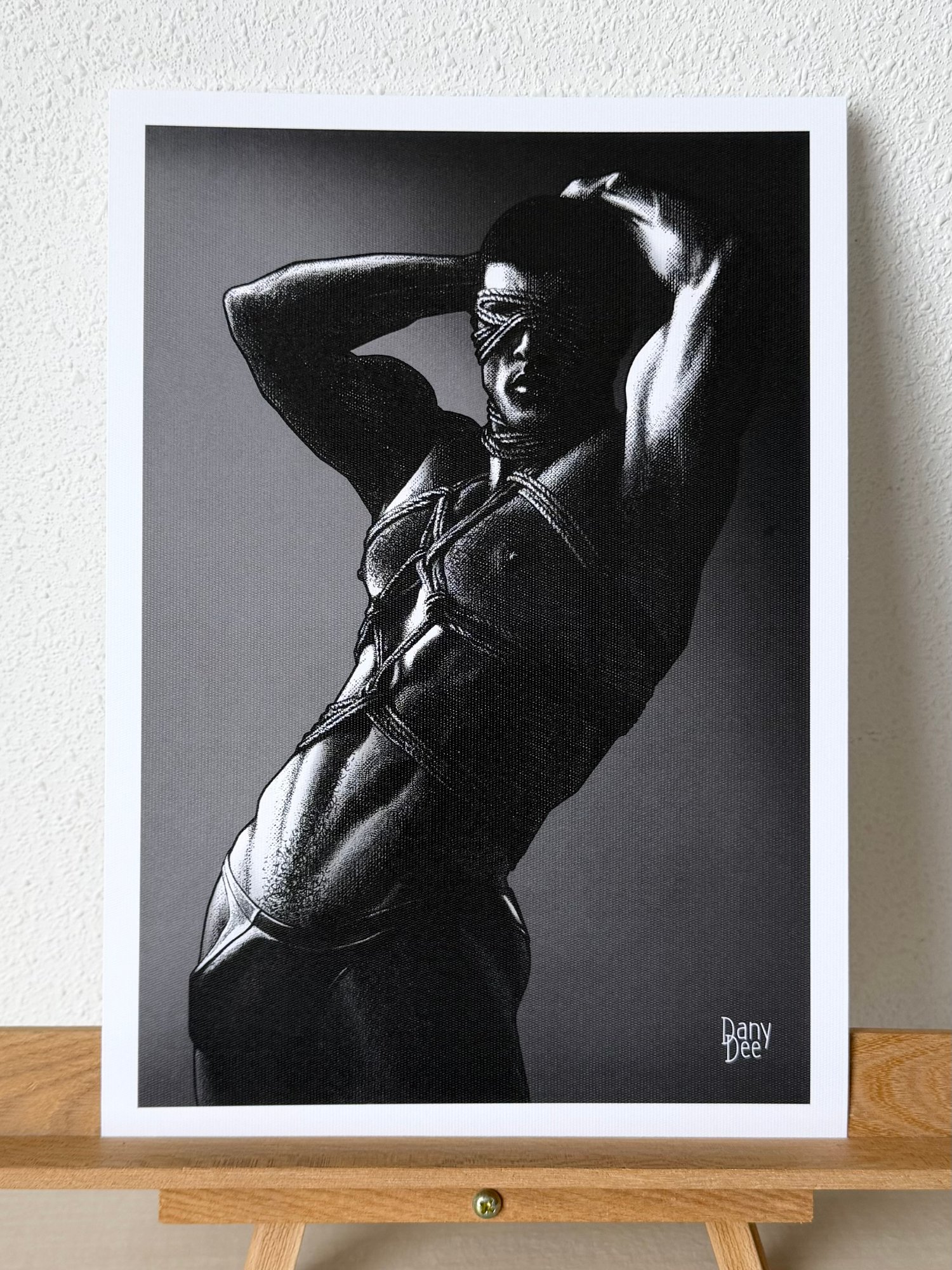 "The Rope No. 2" is a hand-drawn, monochromatic A4 art print celebrating shibari bondage culture — a bold homoerotic illustration of a powerfully built blindfolded man with arms raised in intricate rope bondage, perfect for gay bondage art collectors or queer home decor.