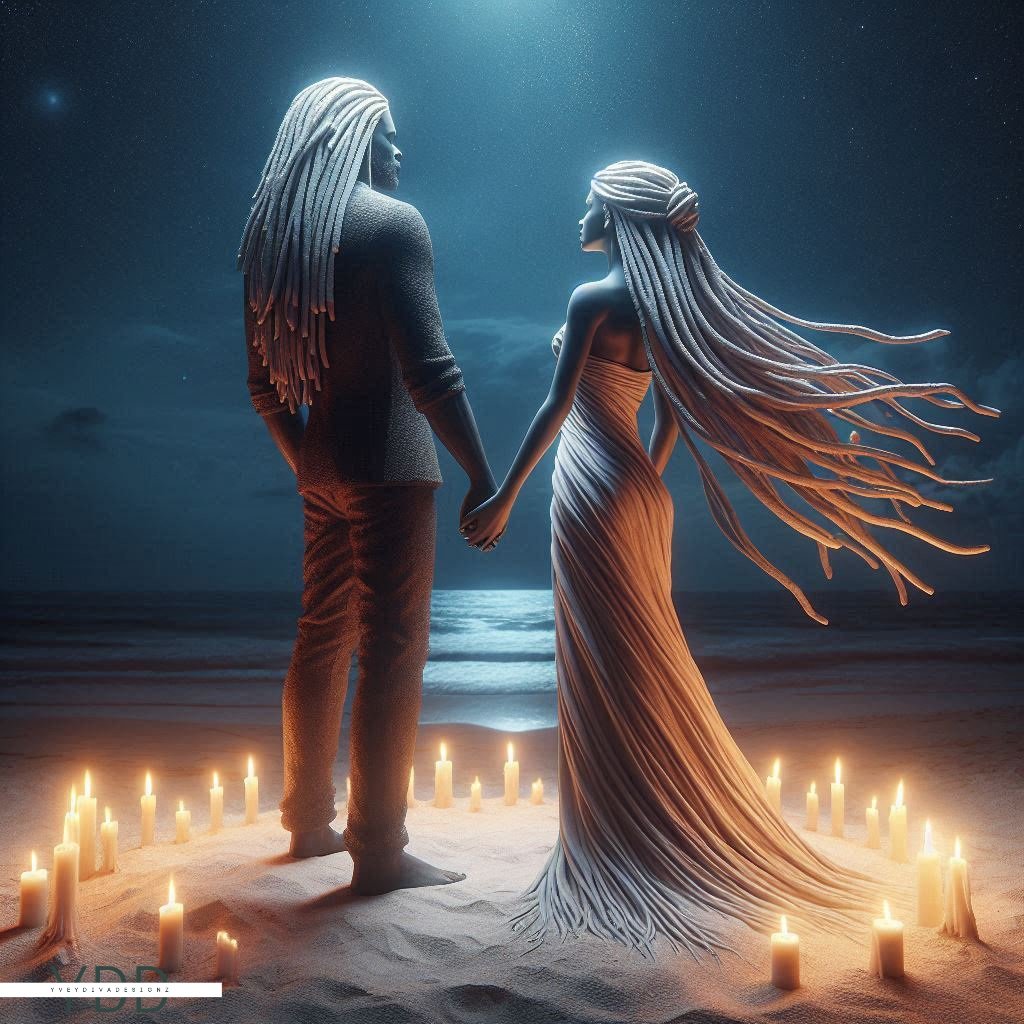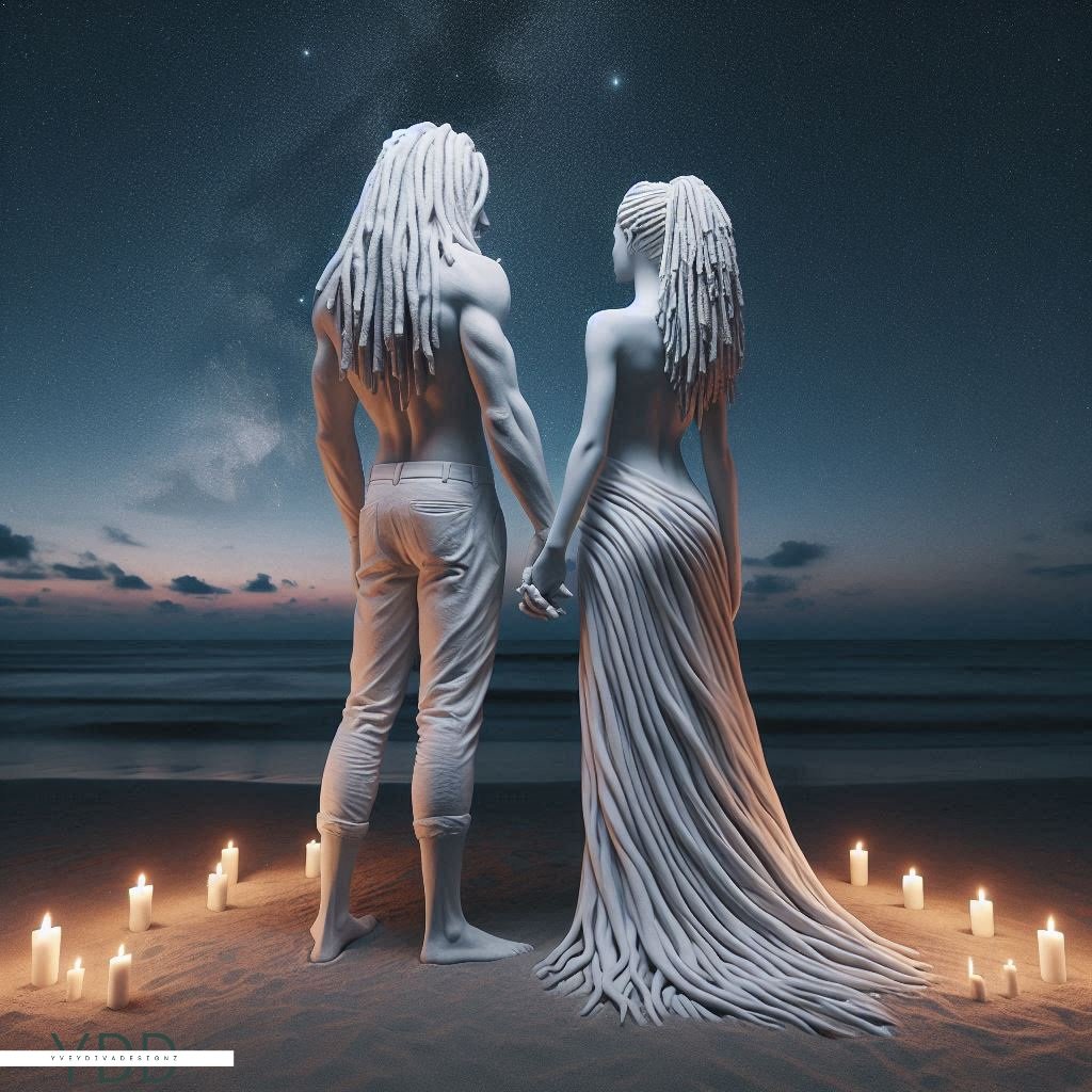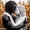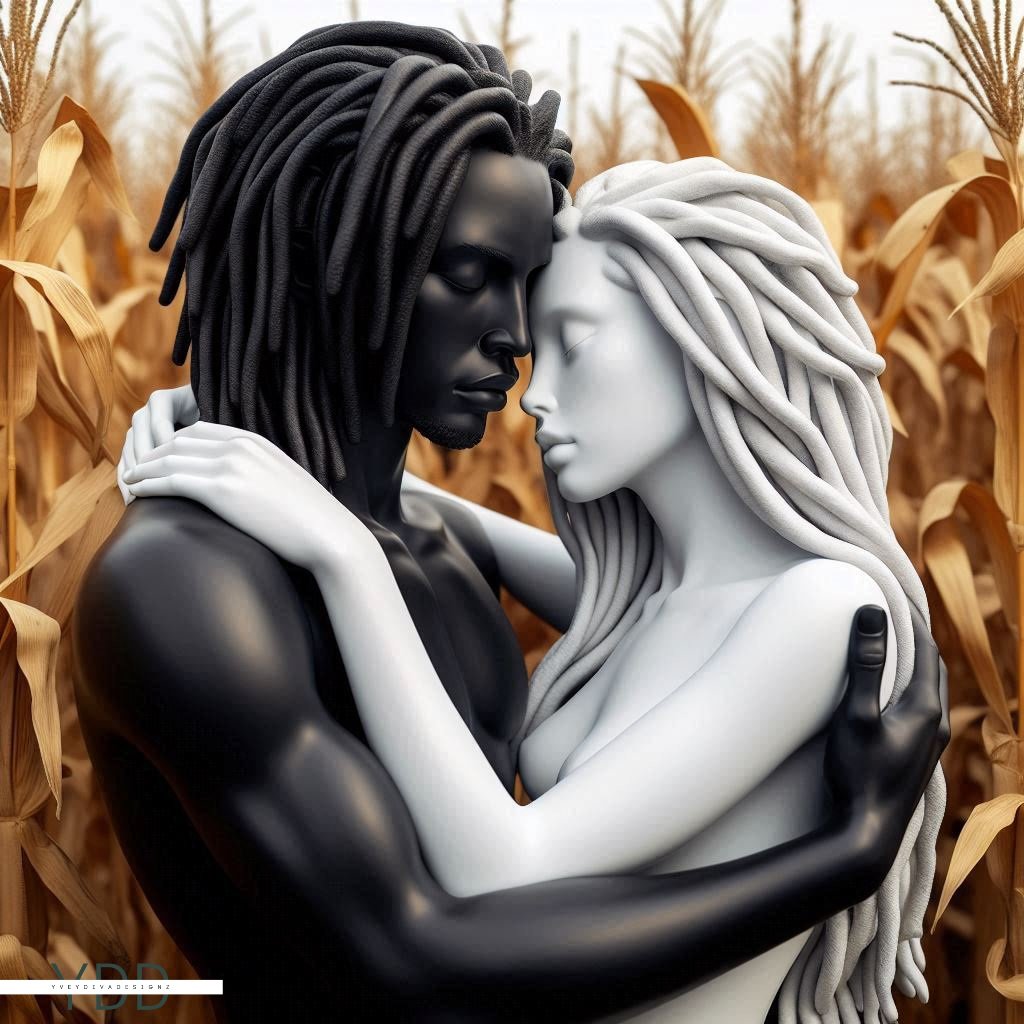 These striking clay models, sculpted in black and white, depict an African American couple standing united on a beach and in a cornfield. The textured contrast of the sand and soil highlights their connection to nature, symbolizing love and resilience across different landscapes.