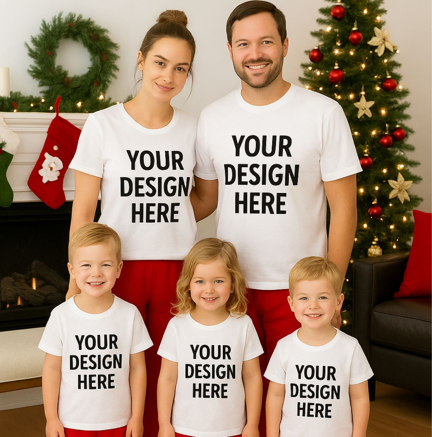 Styled with festive props like pinecones, lights, and matching pajamas, this mockup captures the joyful holiday spirit β perfect for displaying family matching tees or Christmas sweatshirt designs in your Etsy listings.