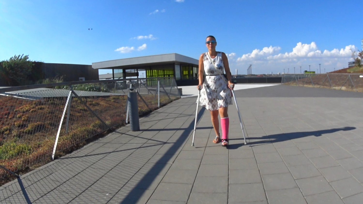 Lucy is walking with a castshoe and two crutches on her way to a outlook.She has a pink short leg cast on her left, leg a dress and a nice sandal on her right foot.When she comes to the steps up to the outlook she take the crutches in one hand and is using the handrail as aid as she gently walks up the stairs.On her way down is Lucy crutching to avoid to put to much weight on her hurt ankle.At the end of the clip we get a great closeup of her cast and her wiggling toes.