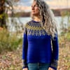 Forest at Midnight is a top down, long-sleeved pullover with gentle waist shaping that leads to a slight A-line silhouette. Fair isle patterning adorns the yoke and sleeves.