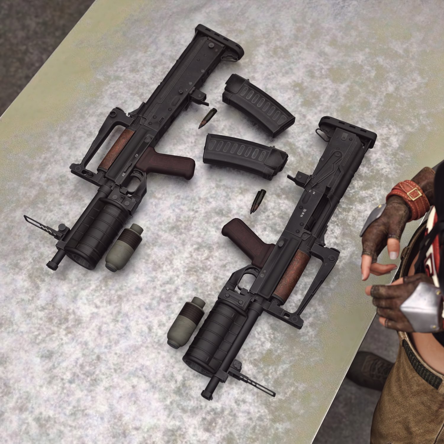 A very cool combat rifle, that never seen a wide use. A bullpup modification of AK rifle, for special forces. This time a modification with an underbarrel grenade launcher. Rigged and converted for use with DAZ. Used by spetsnaz and other special forces for a compact size and good punch. Trigger, safety, bolt, etc also rigged for more realistic pictures. Includes a grenade launcher sight for various porpoises and pictures. Also includes VOG 25 grenade for realistic pics.