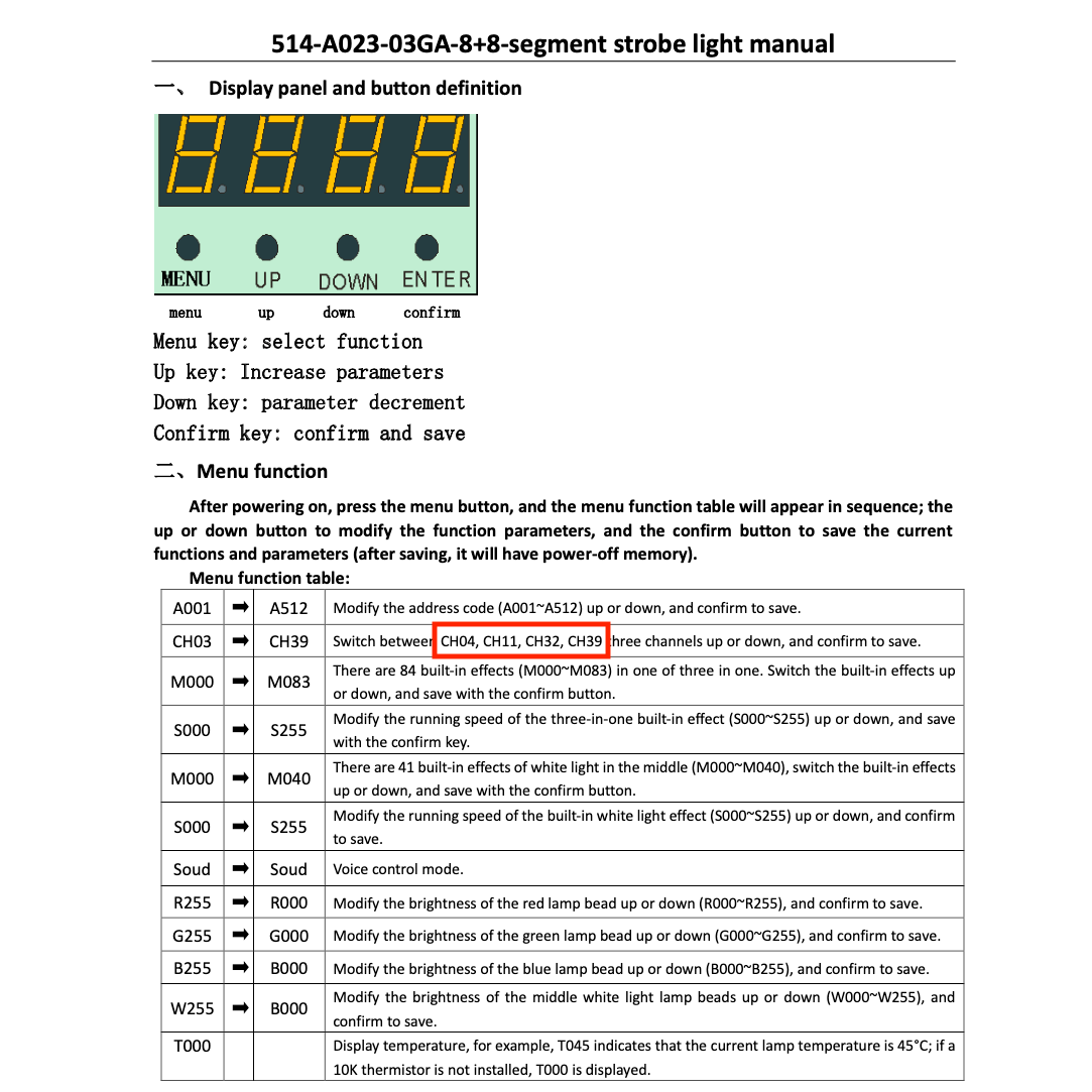 * En el modo CH11 verifique, con un Fixture de pruebas (click), que coincidan estos canales: 1 Dimmer, 7 Azul, 2 Strobo.