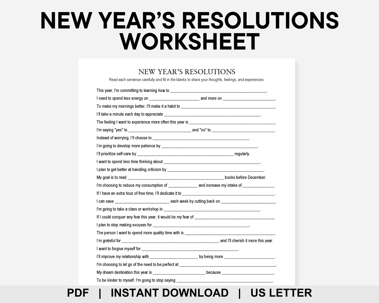 Start fresh, dream big, and write down your resolutions for the new year. This New Year's Resolutions worksheet encourages you to think about the habits, goals, and joys you want to bring into your life. You'll love using it for journaling sessions, family traditions, or goal-setting evenings.